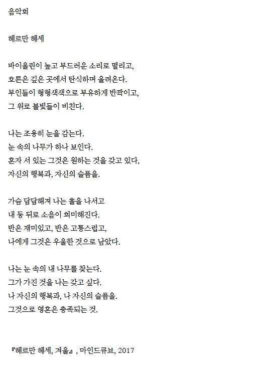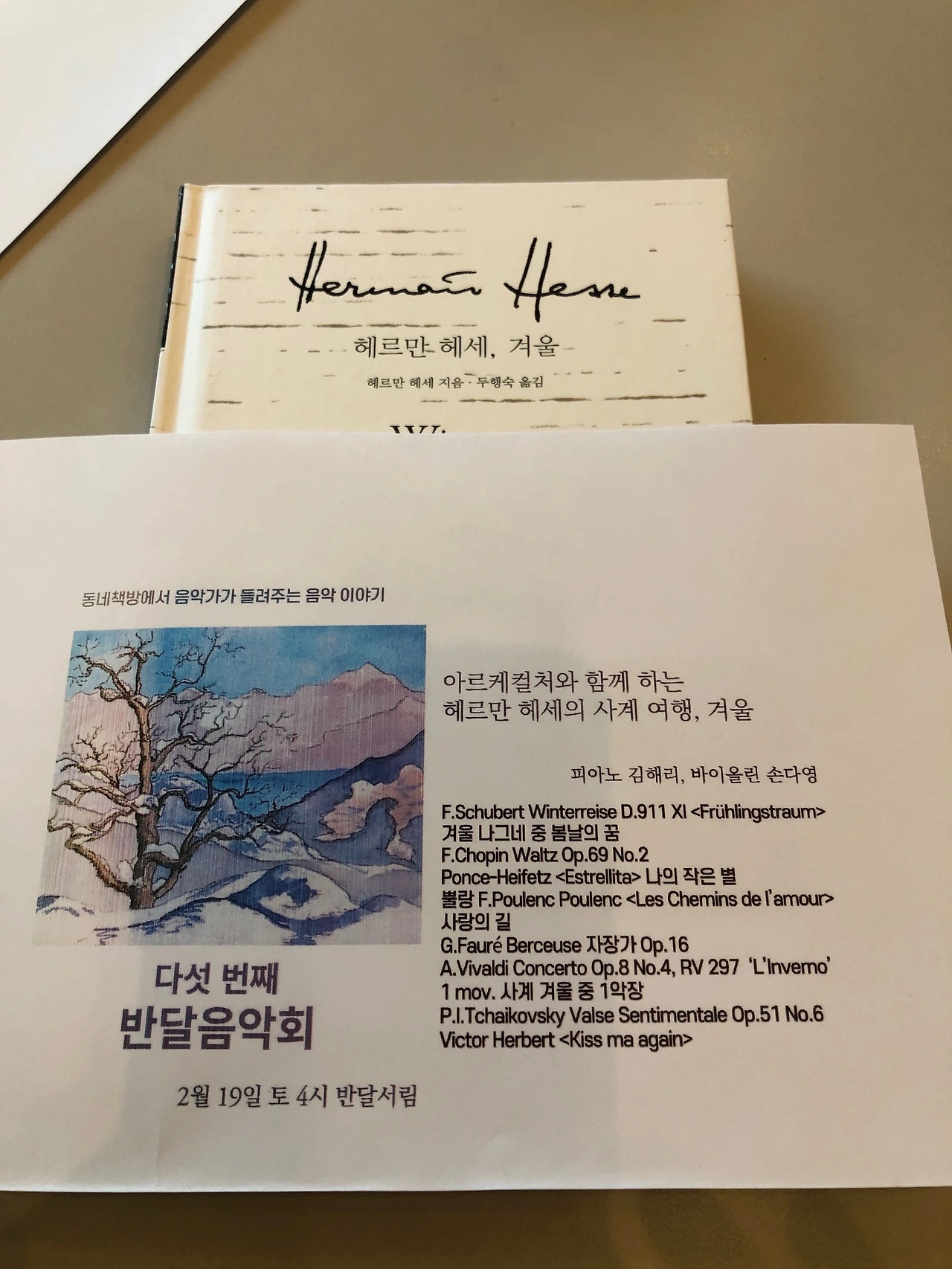 그리고 그 시간 동안 『헤르만 헤세, 겨울』에 수록된 시 「음악회」 속에 들어간 것 같은 느낌을 받았다.「음악회」 시는 공연 바로 하루 전날, 다음 날 있을 음악회를 그리며 반달과5펜스 시필사 모임에서 필사를 하기도 하였던 시. 시 속으로 들어가는 듯한 느낌이란, 시를 읽으며 그린 심상이 음악을 듣는 동안 구체화되면서 뭉클해지는 묘한 느낌이었다.