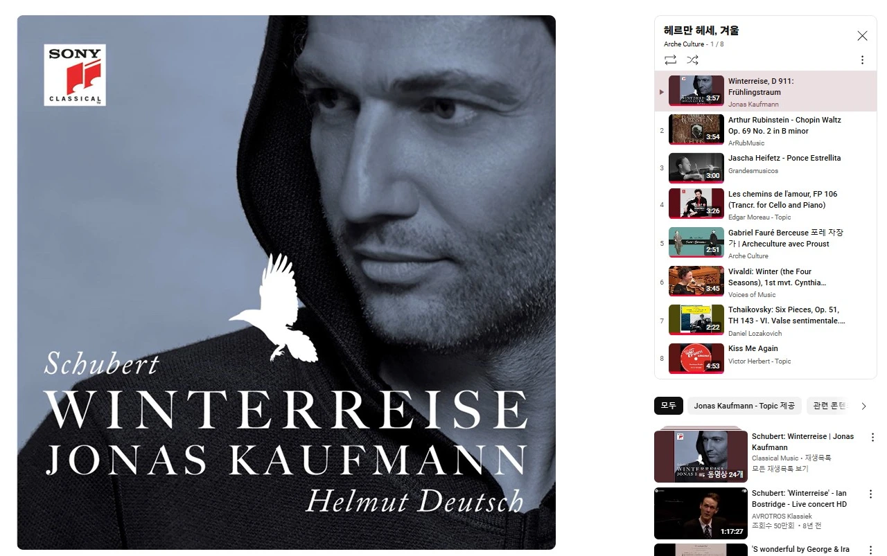 5. 아르케컬처의 유튜브 재생목록 중 「헤르만 헤세, 겨울」(https://youtube.com/playlist?list=PL8UUJ1D1syiSSS1CzBog855AbFAcIezWH&si=U-gNKvrffSjzbaiA)