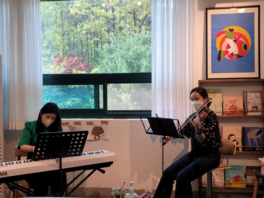 음악이 흐름과 함께 시간도 흘러 음악회 시작할 때의 따뜻한 오후의 노란 햇빛은 어느 덧 평온한 저녁의 푸른 빛으로 바뀌었고, 그와 함께 바이올린 연주자 의상의 꽃무늬 스팽글 나비들도 푸른 저녁 속으로 사라졌다. 시작하는 계절 봄으로 사계절 반달음악회를 마무리하며 다음 음악회는 어떤 기획으로 만나게 될 지 기분좋은 궁금증을 가지고 서점 문을 나섰다.