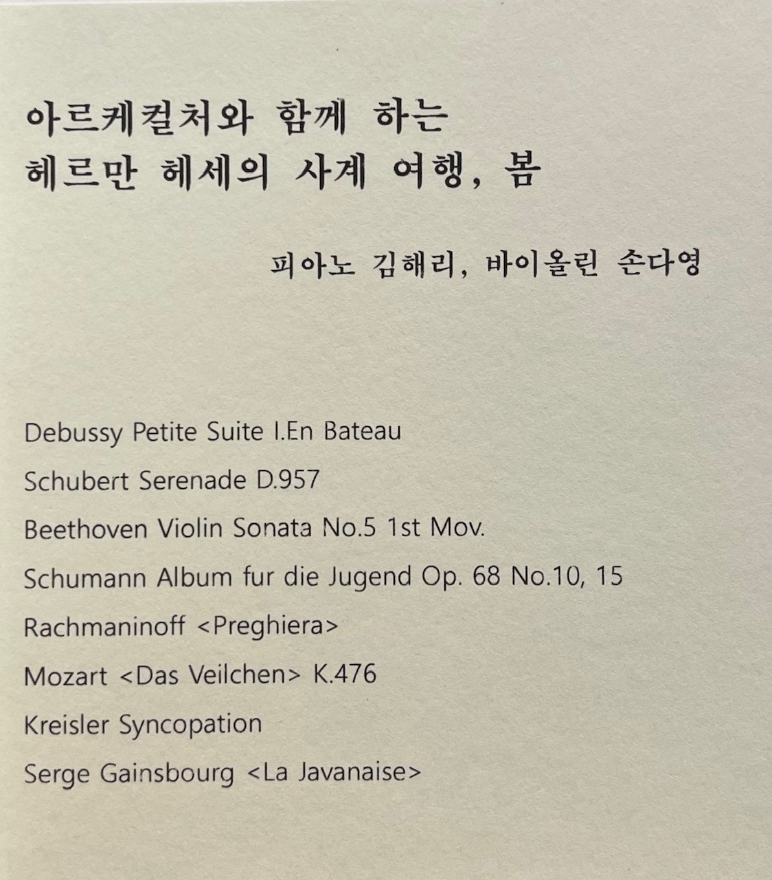 헤르만 헤세의 사계 여행 중 마지막 계절인 봄을 듣는 날, 딱 좋은 나른한 분위기의 봄날 토요일 오후였다. 관객의 기대 속에서 피아노와 바이올린 연주자가 무대에 자리하자, 바이올린 연주자의 의상에 달린 스팽글 꽃잎도 하얀 벽에 다채롭게 반짝였다. 이윽고, 첫 음악 드뷔시의 Petite Suite를 연주하는 바이올린 연주자 몸짓이 시작되자 그에 따라 스팽클이 흔들리고, 색색의 봄햇살 조각들도 일제히 날아올라 책방 내부 이곳저곳을 옮겨 다녔다. 마치 음악에 취한 봄날의 나비처럼...... 봄을 연출하는 효과가 가미된 듯 황홀한 무대였다.