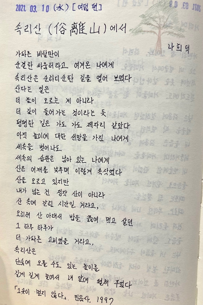 속리산 산등성이에 줄지어 박혀 있던 바위들. 넘을 수 없는 바위를 맞닥뜨리고 결국 그 가파른 고비를 넘지 못하는 그날이 나에게도 오겠지. 그 순간 어떤 마음이 들지 모르겠지만, 아마 반달과 5펜스에서 함께 필사하고 시낭독회에서 나희덕 시인이 낭독하여 준 시 「속리산에서」를 떠올리며 고비를 넘어보고자 한 번 더 힘을 내 볼 것 같다.
