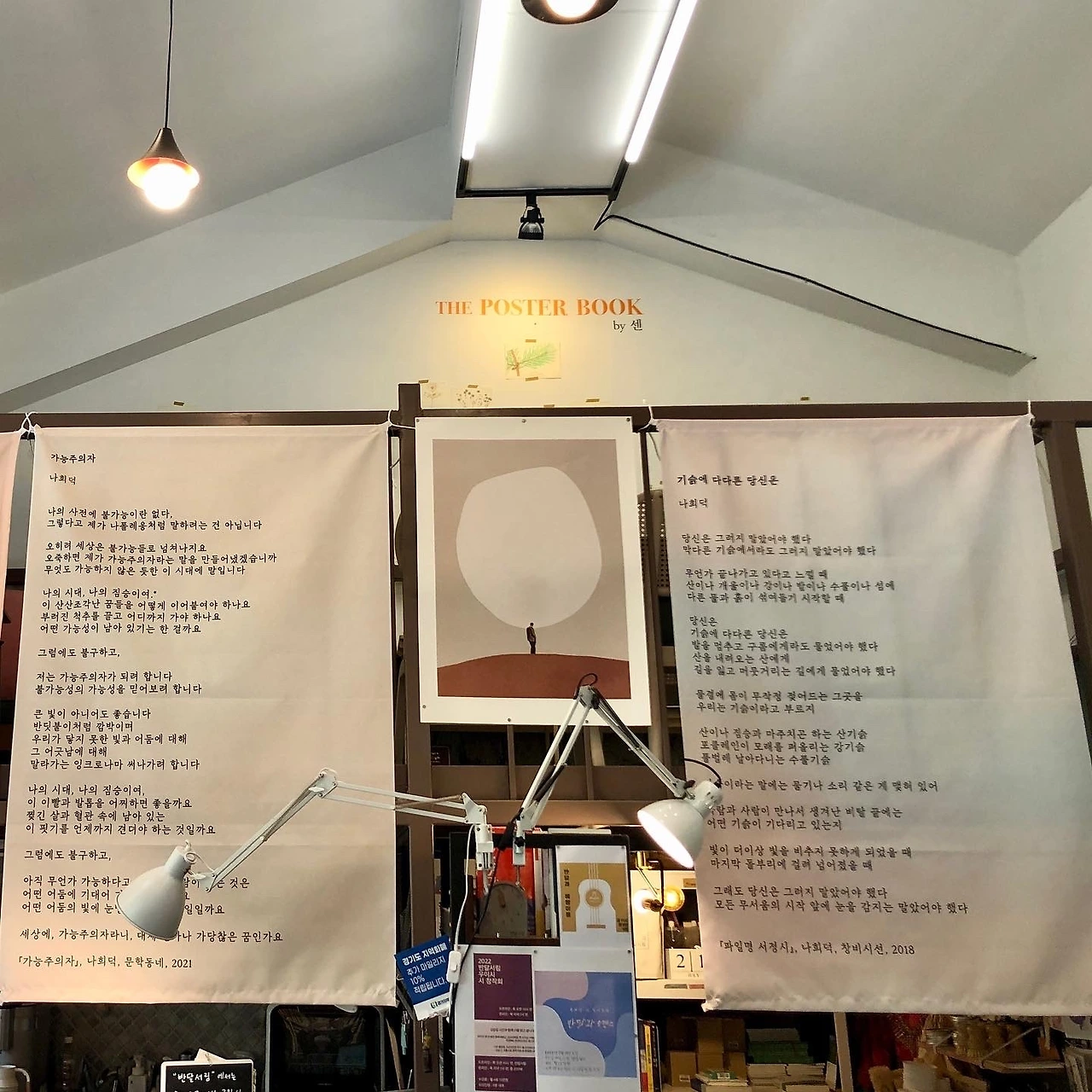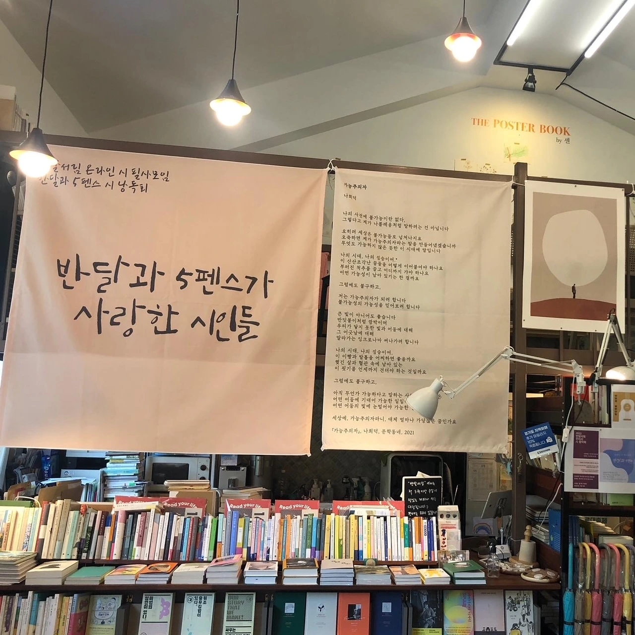 시낭독회가 열리는 날, 설레는 마음으로 책방에 도착하니 베이지색 바탕에 검은색으로 “반달과 5펜스가 사랑한 시인들”이라고 쓰인 현수막과, 같은 색깔로 인쇄한 나희덕 시인의 「가능주의자」와 「기슭에 다다른 당신은」 시 전편이 담긴 현수막이 층고 높은 반달서림 내부 2층 난간부터 드리워진 풍경이 펼쳐졌다. 따뜻하고 부드러운 오후의 햇살 속에 시인은, 호기심 가득한 두 눈을 반짝이며 자식과도 같은 두 편의 시 아래 편안한 모습으로 자리하였다. 한편 대표님은 자신의 책방에 나희덕 시인을 모시고 하는 첫 시낭독회를 개최함으로써, 친구들로부터 비로소 성덕(성공한 덕후)으로 인정받았다며 몹시 상기된 모습이었다.