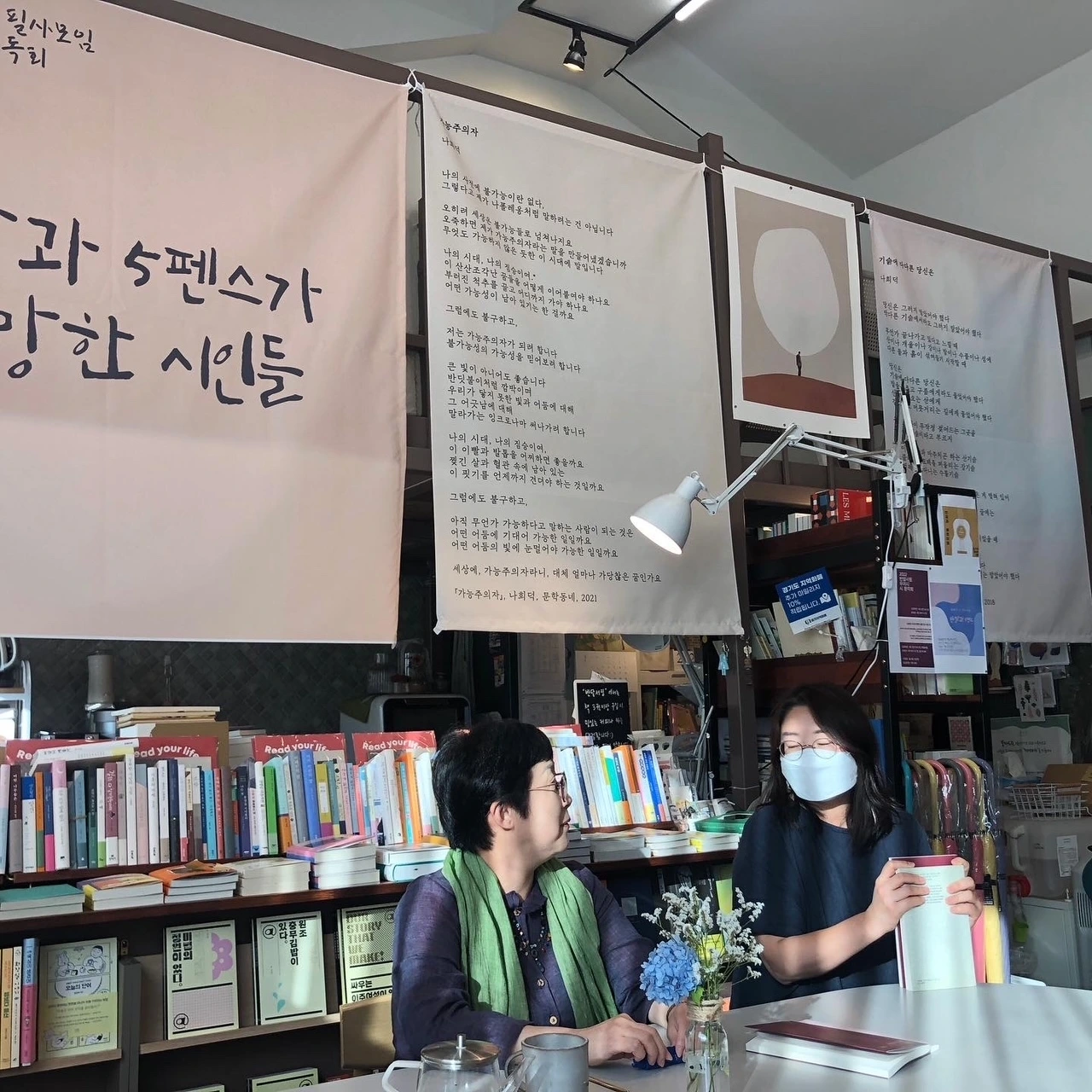 PS. 2년 좀 더 지난 2024년 10월 19일 토요일 나희덕 시인을 반달서림에서 다시 뵈었다. 시선집.『그러나 꽃보다도 적게 산 나여』 를 출간하신 후 시인님께서 먼저 반달서림에서 북토크를 하자고 제안하셨던 것인데, 이 멋진 제안을 당연히 대표님은 기쁘게 받으셨고, 많은 참여자들과 좋은 북토크 시간을 보냈다. 이 후기는 후에 별도의 글로 올릴 생각이다.
