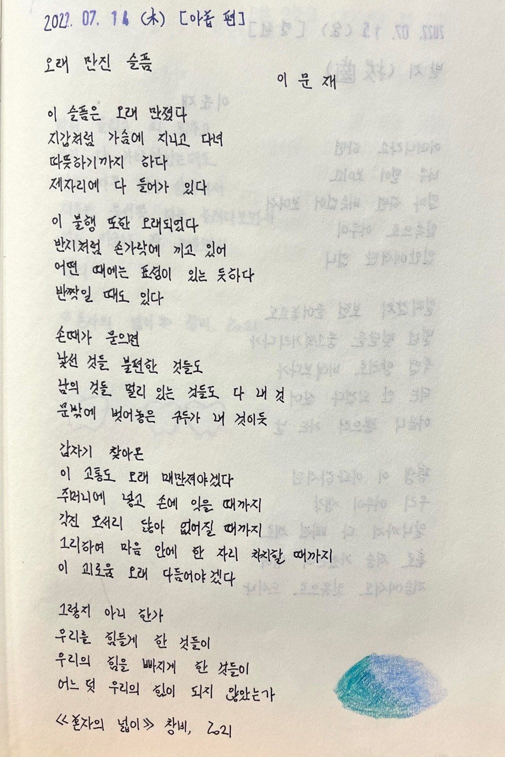 “반달과 5펜스가 사랑한 시인들”과 함께 하는 “반달과 5펜스 시낭독회”에 두번째로 초대된 이문재 시인. “반달과 5펜스”는 이문재 시인 시집 5권에서 발췌한 총 23편 시를 필사하였고, 이 중 「우리가 살던 옛집 지붕」 시의 경우 2021년 9월과 2022년 7월, 두 차례 필사를 할 정도로 이문재 시인 시는 회원들의 사랑을 듬뿍 받았다.