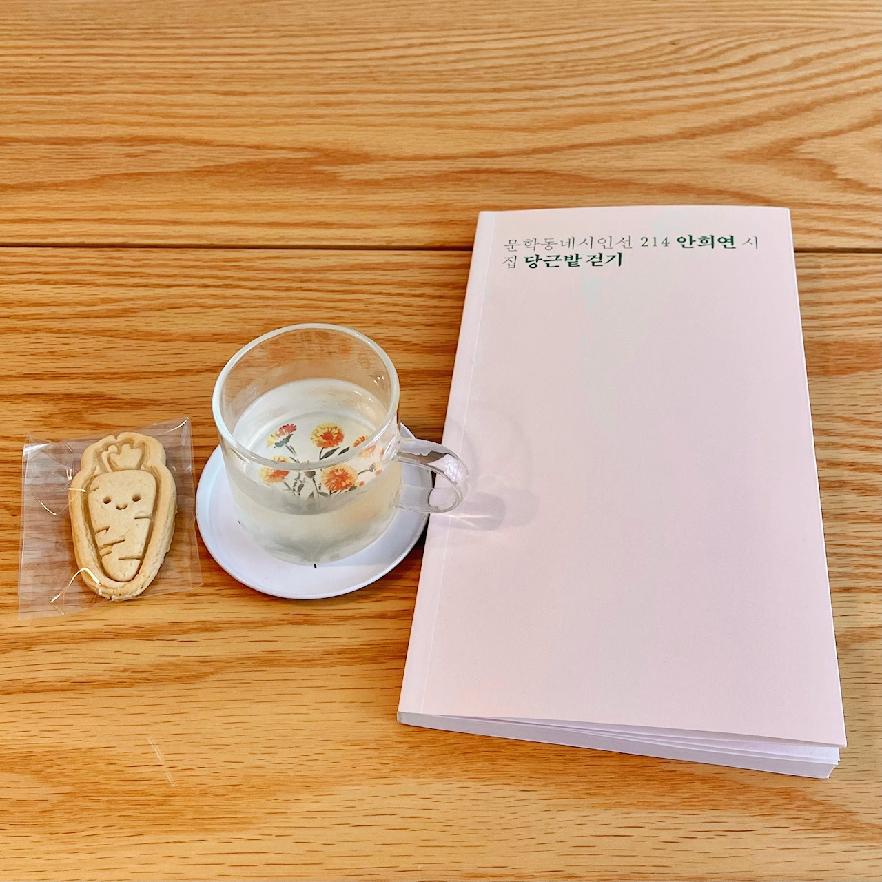 본격적인 시낭독회 전, 티소믈리에이신 대표님은 차를 설명해 주시면서 시낭독회와 함께 할 세 종류의 차를 소개해 주셨다. 하나는 얼그레이, 다른 두 개는 ‘기분좋은 오후’와 ‘나를 위한 시간’이라는 이름의 대표님이 직접 블렌딩 하신 차였다. ‘시가 차오르는 낭독회’에서도 알아봤지만, 블렌딩 차에 븥인 이름에서 다시 한 번 확인된 대표님의 센스와 친절하고 쉬운 설명에 감탄하고는 머리를 맑게 하고 편안한 기분을 들게 하는 차와 시를 즐겼다. 당근 모양의 귀여운 쿠키와 함께……