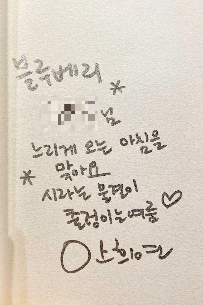 「블루베리밭 기어가기」 제목의 시를 쓰기 위해 아이들이 어릴 때 블루베리 농장에 가서 했던 블루베리 체험을 떠올렸다. 블루베리 나무 사이를 다니며 즐겁게 블루베리를 따서 투명 플라스틱 상자에 모두 채운 아이는, 뿌듯한 표정으로 내게 오던 중 넘어져 들고 있던 블루베리를 쏟아버렸다. 바닥에 사방으로 흩어진 블루베리를 함께 주웠던 기억이었다.