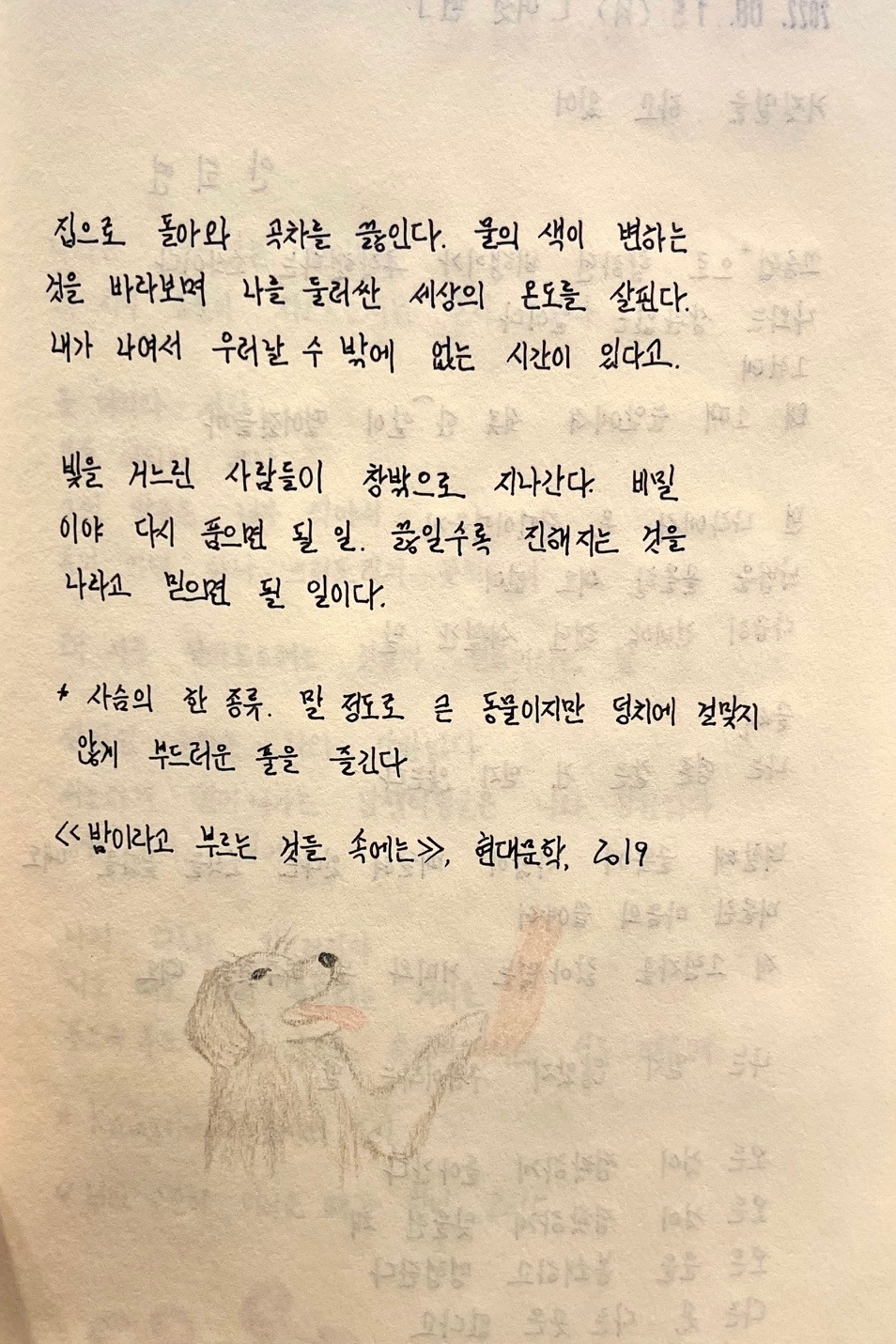 안희연 시인은 특히, 이 『당근밭 걷기』 시집의 시를 순서대로 읽기를 권했는데, 짝패가 되는 시가 있다고 귀띔을 해주었기에 시집을 한 번 더 읽어야겠다는 생각을 했다. 2020~2024년의 코로나로 힘겨웠던 시간에 고립과 단절의 감각이 지배한 시, 삶의 중력을 체감하도록 사람이 구해지는 문장을 써야겠다는 시인의 마음을 음미하며 읽어봐야겠다.