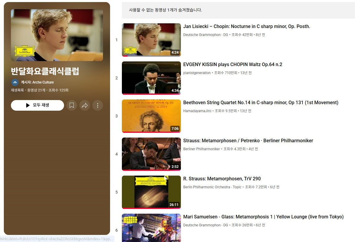 8. 아르케컬처의 유튜브 재생목록 중 반달화요클래식클럽 『철학자의 음악서재, C#』 (https://www.youtube.com/playlist?list=PL8UUJ1D1syiRcK-sRAzXaZORoSKBbgxoM)