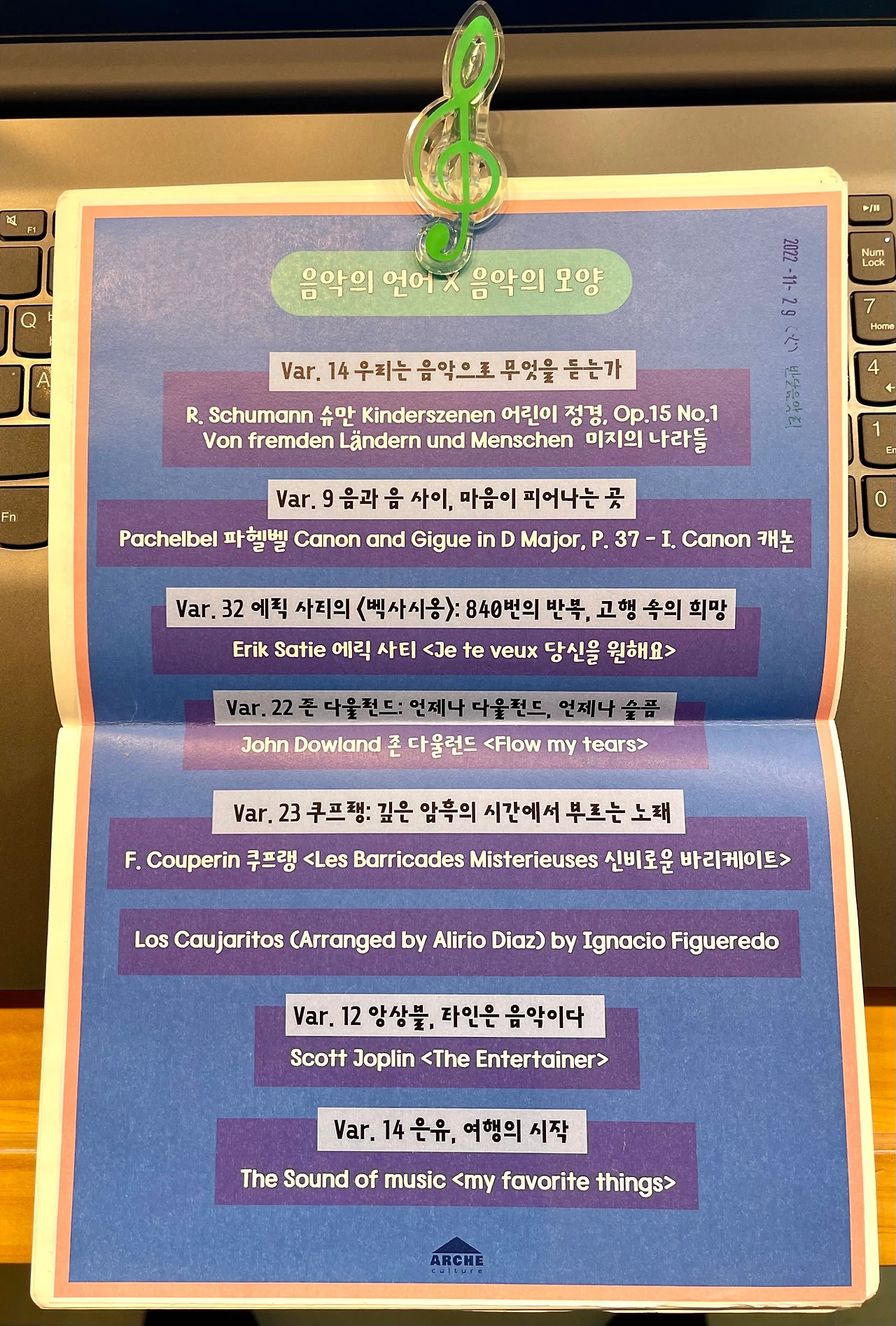 두 번째 곡은 파헬벨의 「캐논」, 음과 음 사이 마음이 피어나는 곳. 음표에 마음을 싣는 연습을 하려면 음표도 연구해야 하지만 그에 맞게 음표에 실을 내 마음도 살펴봐야 한다. 캐논의 한 음 한 음 실은 연주자의 마음은 어떤 것일지 가늠해 보았다. 꽃을 심는, 불을 밝히는 듯한 마음인가......