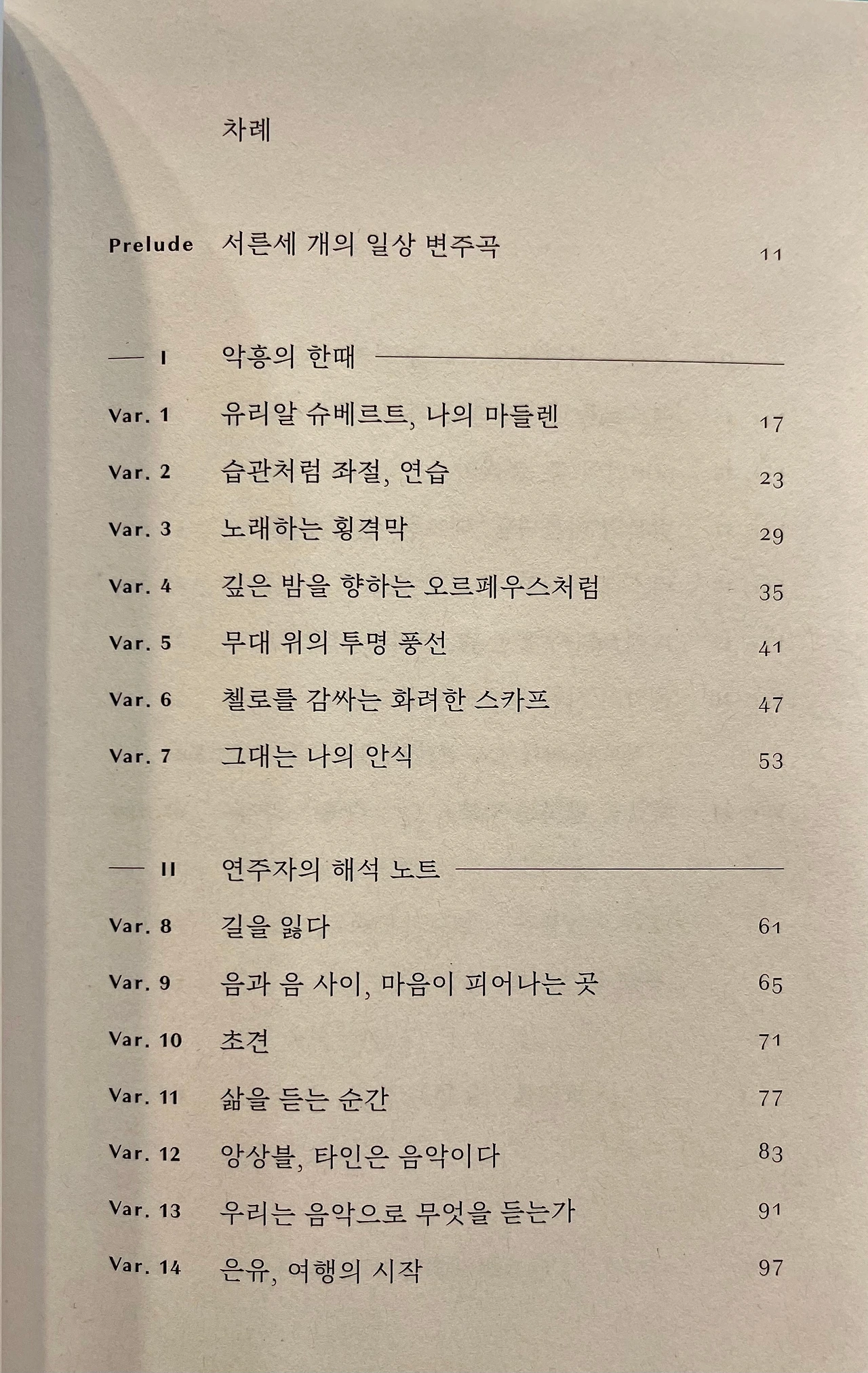그런데, 또 혼자 연습을 하려니 생각이 나지 않고 악기 위에 손가락이 어색하다. 좀처럼 익숙해지지 않을 것 같은 어색한 연주가 연습 횟수가 거듭 될수록 점차 편안해지는 경험, 그러나 여전히 어려운 구간이 남아있어 그 부분이 가까워 오면 긴장이 되지만, 그 마의 구간을 무탈하게 넘어갈 때 느끼는 안도감, 혹은 실수를 하거나 연주하지 못하고 지나 보낼 때 느끼는 아쉬움이 딱딱하게 굳은 감정을 말랑하게 만든다.