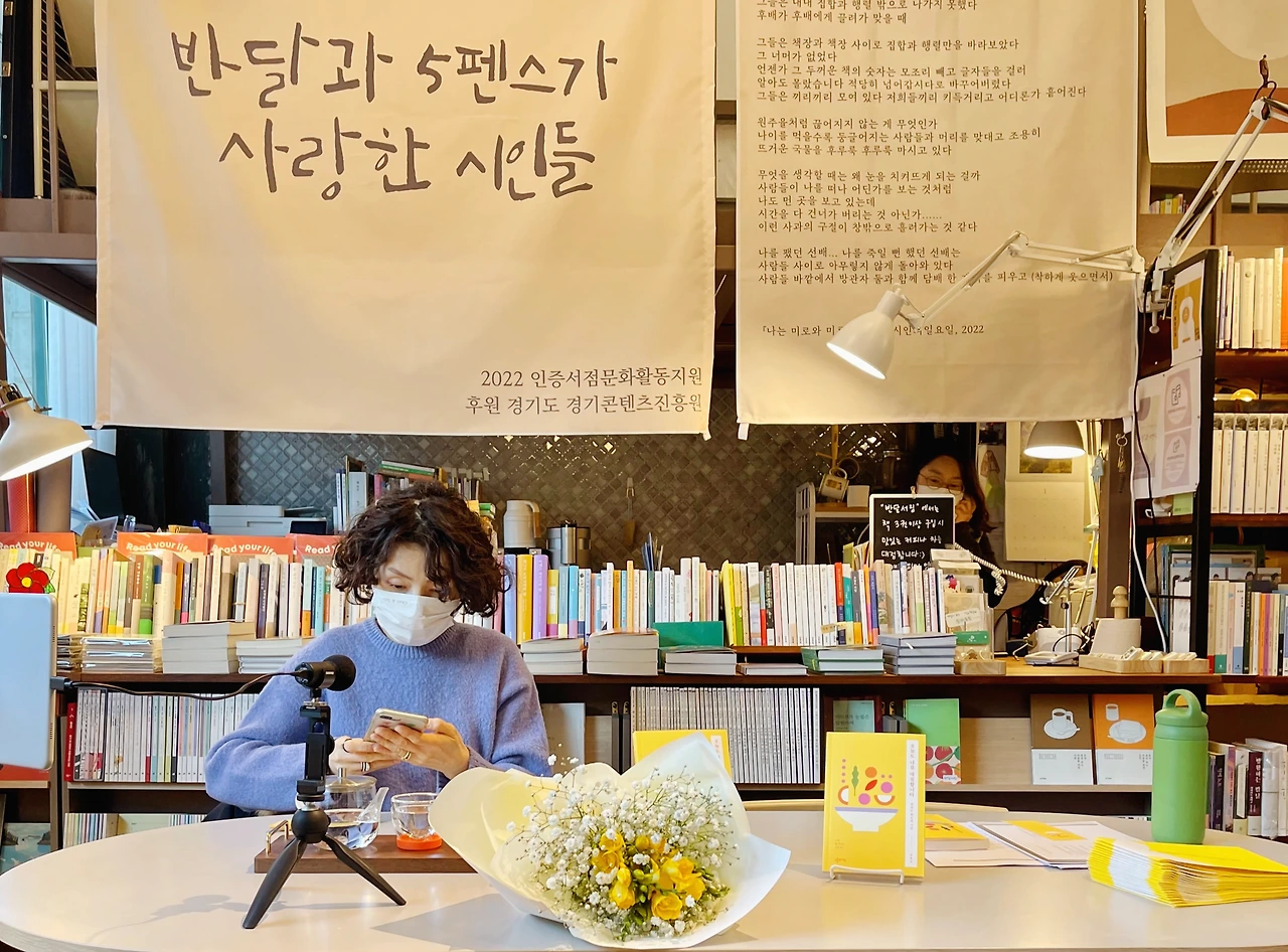 『언더그라운드』의 양희 작가처럼 강효진 작가 또한 우리 동네작가이자 동네책방 반달서림을 애정하는 작가라서일까? 북토크를 시작으로 강효진 작가와의 행복한 만남은 2025년 6월인 지금까지 계속되고 있다. 처음엔 ‘반달과5펜스가 사랑한 시인들’의 시낭독회와 같은 행사에 관객으로서 참여하며 서로 인사를 나누는 정도였는데, 2024년 말부터 작은 배를 함께 타며 유대감을 느끼는 관계로 발전하게 된 일이 생겼다. 그 일은 반달서림 대표님 남편의 해외주재원 발령에서 비롯되었다. 먼저 해외에 나가 있는 남편에게 자녀와 함께 출국하여 합류해야 했던 대표님은 이제 갓 3년을 넘긴 시점에 이대로 반달서림을 정리하기엔 너무 아쉬웠다고 했다.