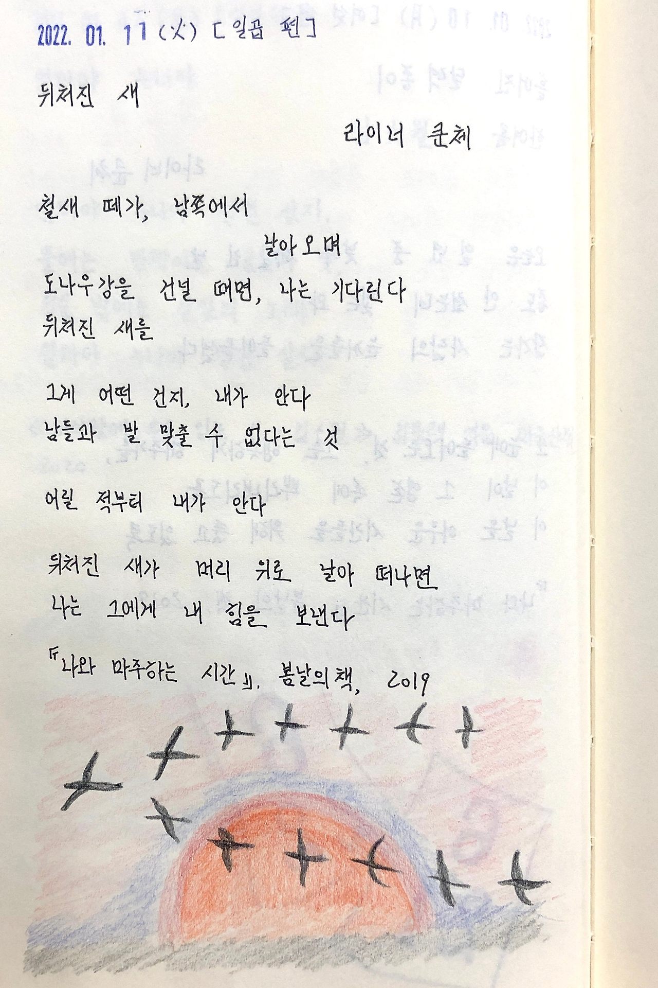 『꿈꾸고 사랑했네 해처럼 맑게』 58쪽에 「뒤쳐진 새」 시 전편과 그에 얽힌 전영애 교수님 에피소드가 있었고, 반가움으로 읽고 나니 그 시가 더욱 사랑스럽게 느껴졌다. 사람을 만나기 쉽지 않은 코로나 시기에 전영애 교수님께 독일 여행일정이 생겼고 체류 일정에 맞추어 라이너 쿤체 시인 방문을 계획했지만, 상황이 여의치 않으셔서 장문의 편지 한 장을 공들여 써서 라이너 쿤체 시인께 팩스로 보내셨다. 그런데 당일 「뒤쳐진 새」 시 한 편과