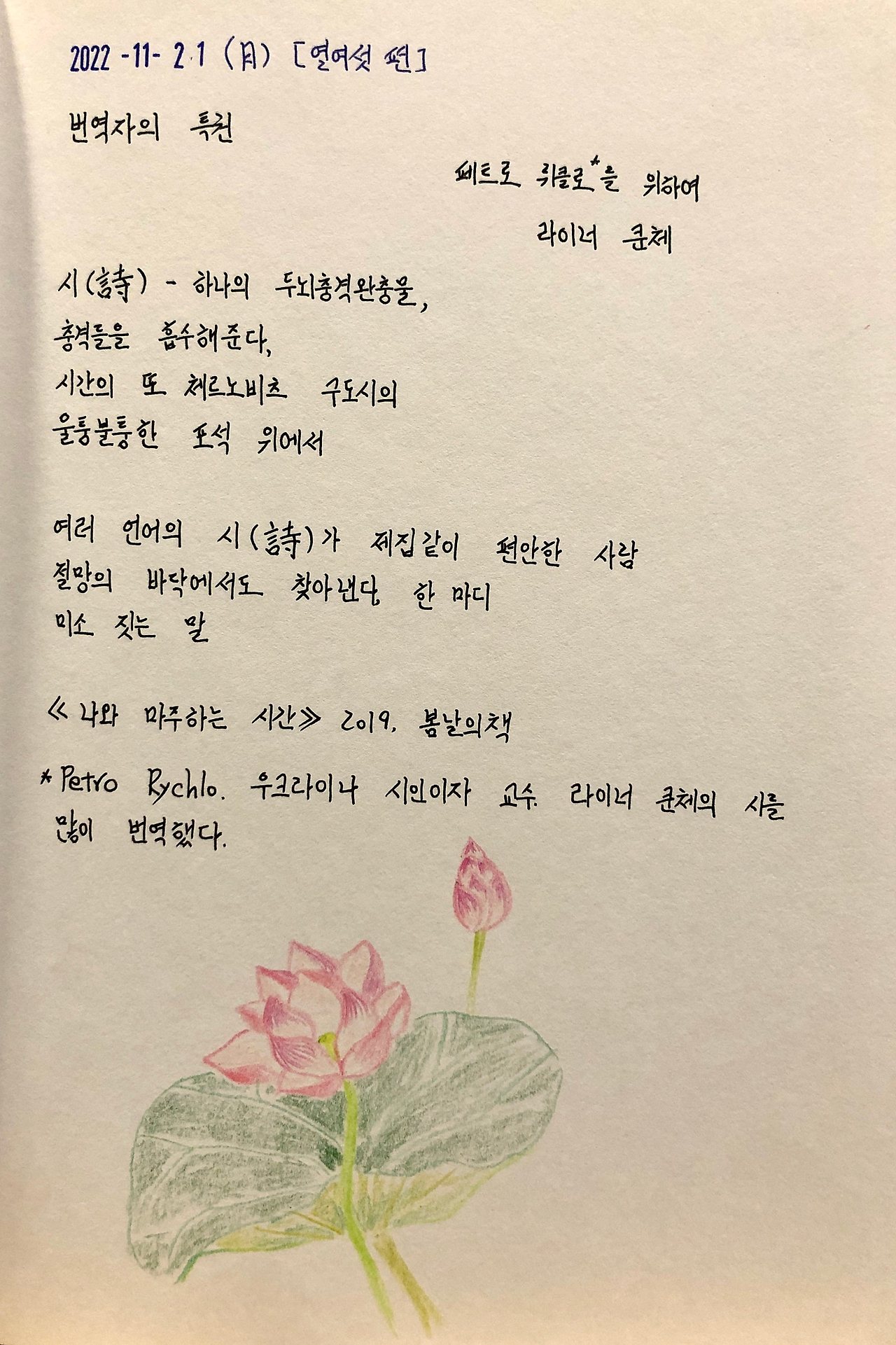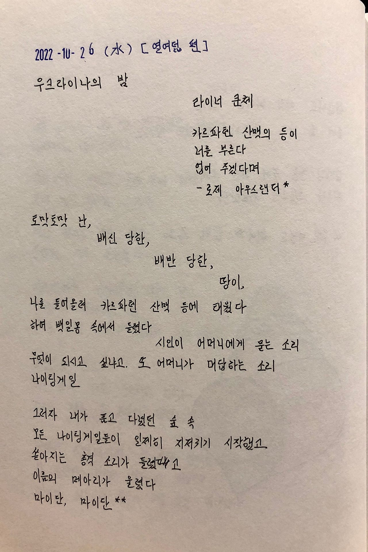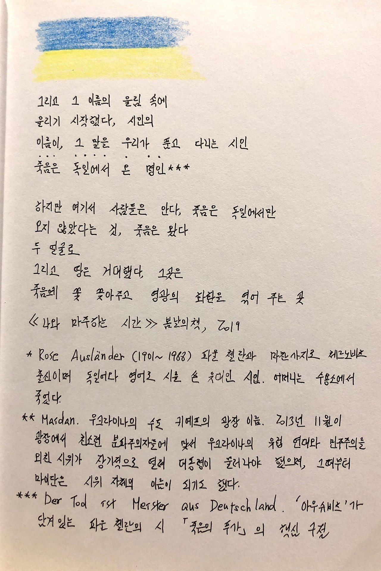 2013년 동구권의 분쟁에 대한 우려를 담은 시이지만, 2022년 2월 시작되어 아직까지 지속하고 있는 러시아-우크라이나 전쟁에 대한 걱정으로도 읽힐 수 있는 「우크라이나의 밤」, 자신의 시를 각국의 언어로 번역하는 번역자들에 대한 감사를 담은 「번역자의 특권」, 그리고 한국에 애정이 각별한 라이너 쿤체 시인이 한국독자를 위해 쓴 시 「뒤처진 새」가 그것.