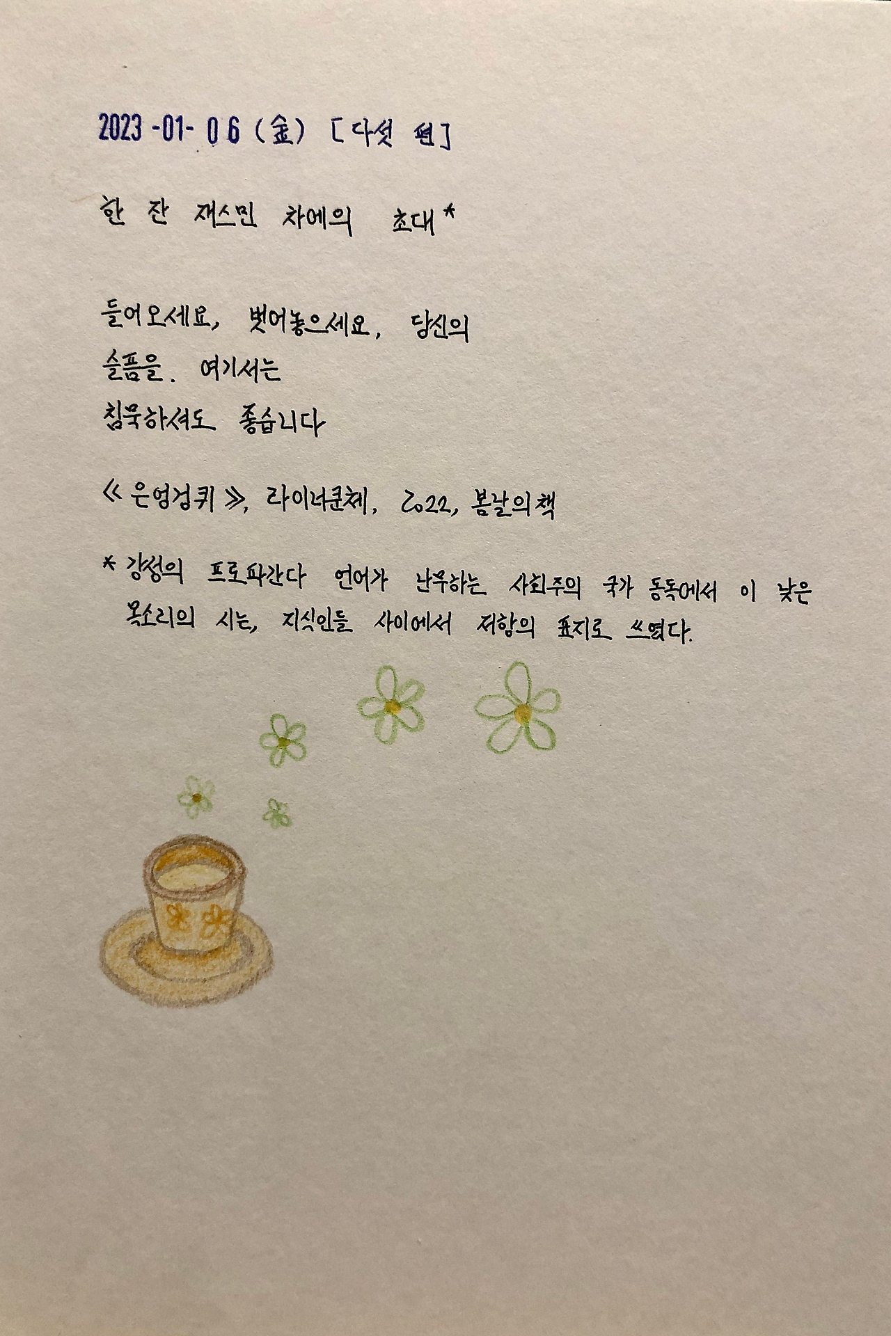 라이너 쿤체에 대해 조금 더 살펴보면, 독일이 통일되기 전 동독 시민들은 동독 시절 체제에 동의하지 않는다는 저항의 의미로 라이너 쿤체 시인의 짧지만 깊은 시 「한 잔 재스민 차에의 초대」를 집의 문 앞에 걸어 놓았다고 한다. 이에 동독 정부는 라이너 쿤체 시인의 말이 갖는 힘을 두려워하여 서정시를 쓰는 시인은 학생을 교육할 수 없다는 논리로, 대학에서 강의를 하고 있던 라이너 쿤체 시인을 내쫓아 자물쇠 수리공으로 만들었고…… 자물쇠 수리공일을 하며 시를 계속 써내려 간 라이너 쿤체는 1977년 서독으로 망명하기에 이르렀다. 시인 라이너 쿤체는 말 그대로 현대 세계사를 관통한 삶을 살며 힘든 시기를 보냈지만, 신념을 지키고 생명을 존중하며 인간성에 대한 믿음을 잃지 않은 시인이었다.