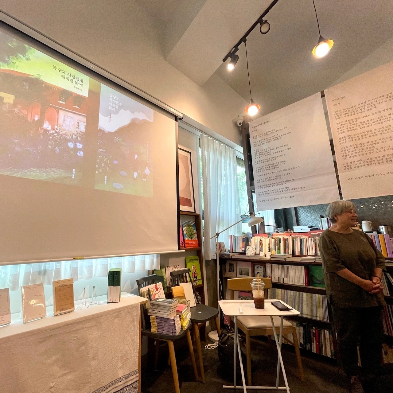 이윽고 북토크가 시작되고 자그마한 체구의 칠순을 넘기신 전영애 교수님께서 약 2시간 남짓한 북토크를 서서 진행하셨다. 의자에 앉아 진행하시기를 권해드렸지만, 서서 강의하시는 것이 편하시다며 그대로 강연을 하셨는데, 정말 나이는 숫자에 불과하다는 듯 교수님의 젊은 열정과 에너지가 전해졌다. 직접 찍으신 듯한 많은 사진 자료에 담긴 놀랍고도 멋진 이야기. 연륜과 애정으로 술술 풀어내시는 교수님 강연에 빠져들어 반달서림 공간은 그 순간 또 하나의 여백서원이 되었다.
