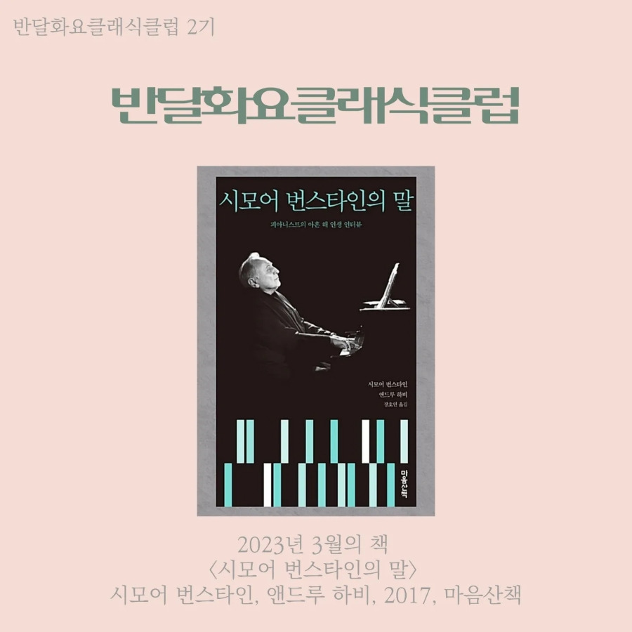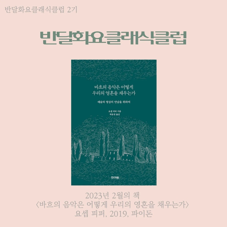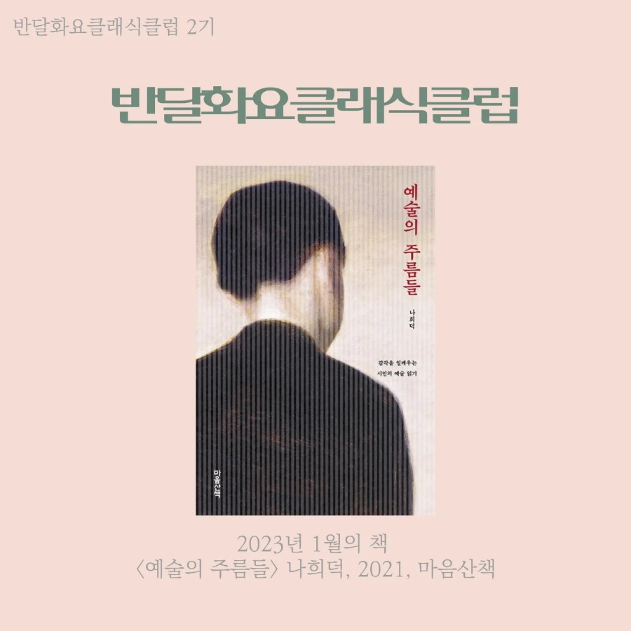 2023년 6월은, 2022년 10월에 시작해 한 달에 두 번 격주로 만나 예술 관련 책을 읽는 모임 반달클래식클럽 3기가 종료되는 시점이었다. 반달클래식클럽 1기가 시작된 후 함께 읽은 책이 총 9권이었는데, 그 사이 첫 번째 책이었던 『철학자의 음악서재, C#』 온라인 북토크 (https://brunch.co.kr/@ebec0174a6a7411/31)와 두 번째 책 『음악의 모양』을 주제로 한 음악회 (https://brunch.co.kr/@ebec0174a6a7411/33)가 열리기도 했다.