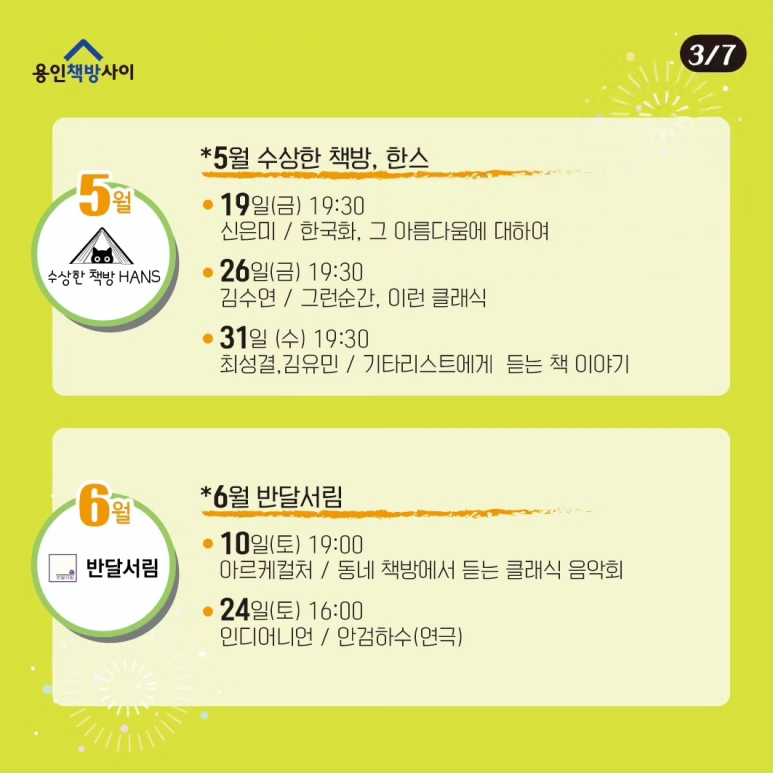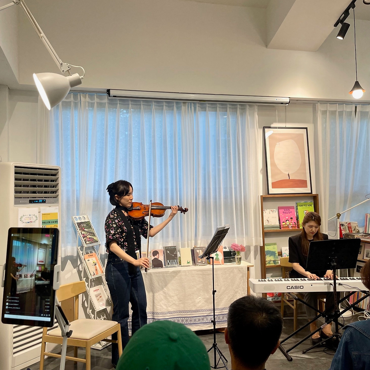 이번 반달음악회는 용인책방데이 프로그램의 일환으로, 5월부터 10월까지 용인 지역 내 동네 책방에서 각자 기획한 문화 프로그램을 가지고 릴레이 형태로 참여하는데, 반달서림에서는 반달음악회와 반달극장을 계획하였다고 말해주었다. 반달음악회는 이제 제법 익숙해졌는데, 반달극장에서 상연되는 연극은 또 어떨지....... 토요일 밤 집에 돌아가는 길의 발걸음은, 아직 잔잔하게 남은 음악회 감동과 다음 연극에 대한 기대감으로 가볍기 그지없었다.