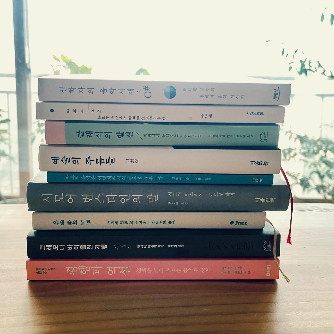 연주자의 연주무대 뒤 테이블에 진열된 친숙한 9권의 책, 저 책을 모두 읽었다는 사실 하나만으로도 뿌듯했고, 책과 함께 나눈 이야기, 그때의 분위기에 대한 기억이 음악회 연주를 듣는 동안 환기되어 뿌듯함 위에 재저장 되었다.