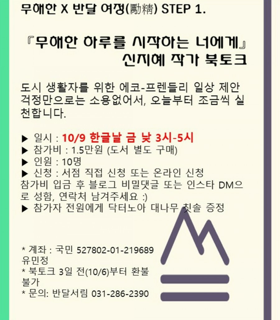 나는 반달서림의 "무해한 X 반달여정" 3단계 중 1단계인 북토크에만 참여하였지만, 전체 프로그램은 2단계에서 무해한 반달챌린지로 15일 동안 매일 책의 한 구절을 필사와 실천 사항 인증 사진을 공유하는 활동을 진행하고, 3단계에 무해한 반달 칭찬받기로 챌린지 참여금을 달성률에 따라 서점 적립금으로 돌려받아 도서를 구매하는 프로그램이었다.