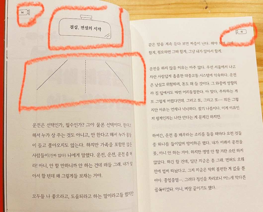 두 권의 스노우캣 운전툰을 고양이라는 공통분모 하에 재미있게 읽었다면, 이 책 『마침내, 운전』은 같은 동네주민이라는 공통분모를 바탕으로 재미있게 읽었다. 비교적 큰 활자, 작은 판형 그리고 180페이지 정도의 짧은 에세이라 앉은자리에서 휘리릭 읽을 수 있었는데, 페이지를 기재한 방식이 너무도 앙증맞음에 감탄과 칭찬을 금할 수 없었다. 유난히 눈이 맑고 동그란 신예희 작가도 ‘기발하지 않나요?’라며 그 부분에 엄청 뿌듯해하시고……