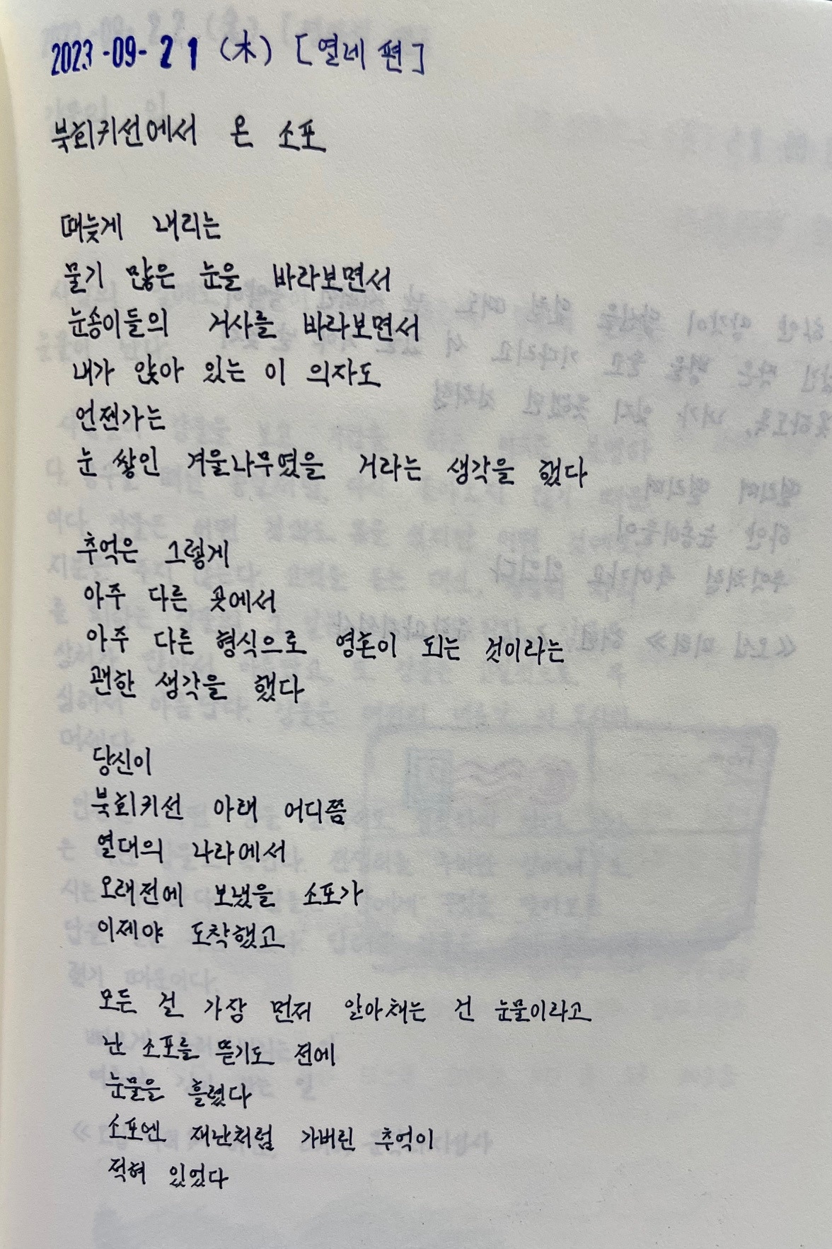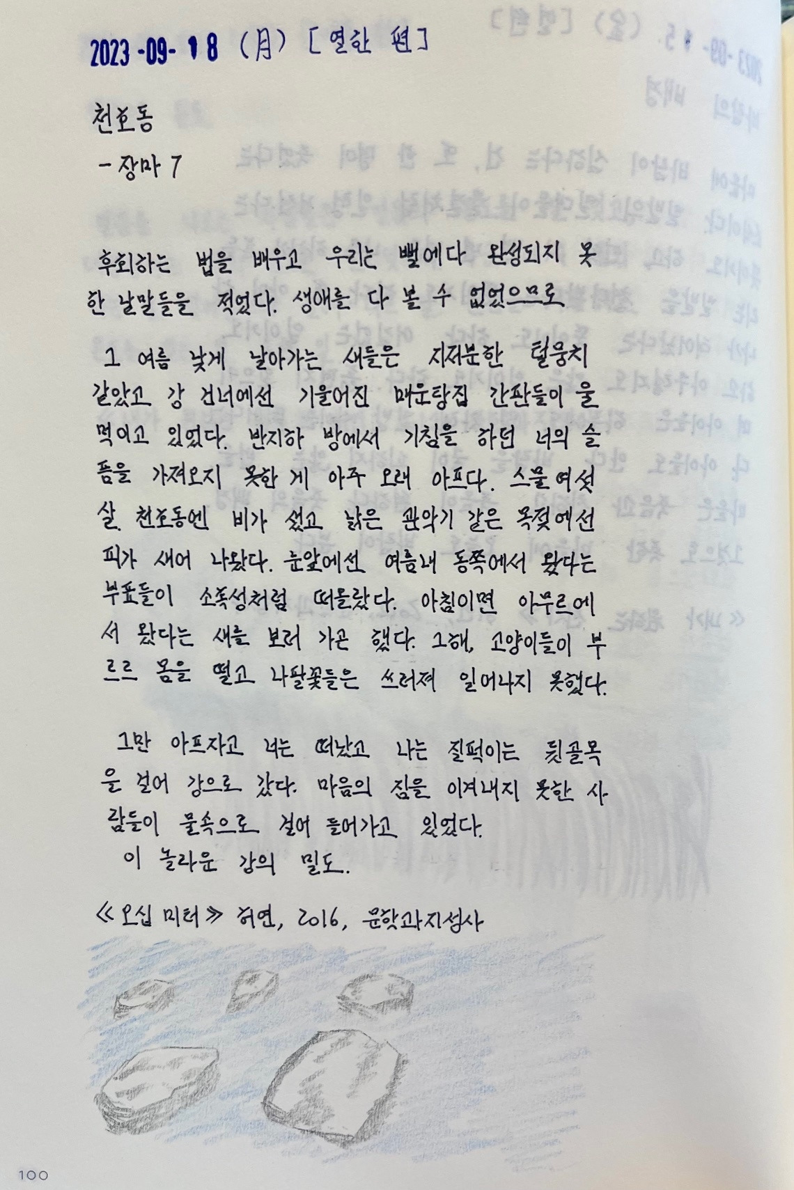 소포를 받고 발송자를 알게 되었을 때, 심장은 얼마나 큰 소리를 내며 내려앉았을지, 소포 내용물이 자신의 망친 시라는 것을 확인하고 어떤 느낌이었을지 상상해 본다. 지난 연인이 자신의 망친 시를 주워 모으고 있다는 것을 알았을까? 몰랐을까? 왜 그녀는 이 시들을 다시 돌려준 것일까? 내가 버린 과거의 망친 시를 다시 받아 망각으로부터 소환된 추억의 물성은 어떤 종류의 것이었을까? 꼬리를 물고 올라오는 질문에 대답을 생각해 보기도 하고, 그냥 던져진 질문을 그대로 두기도 하며 시 읽기를 즐긴다.