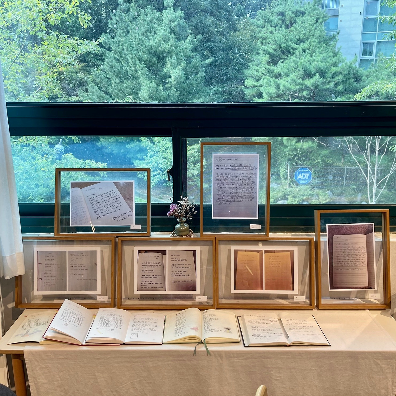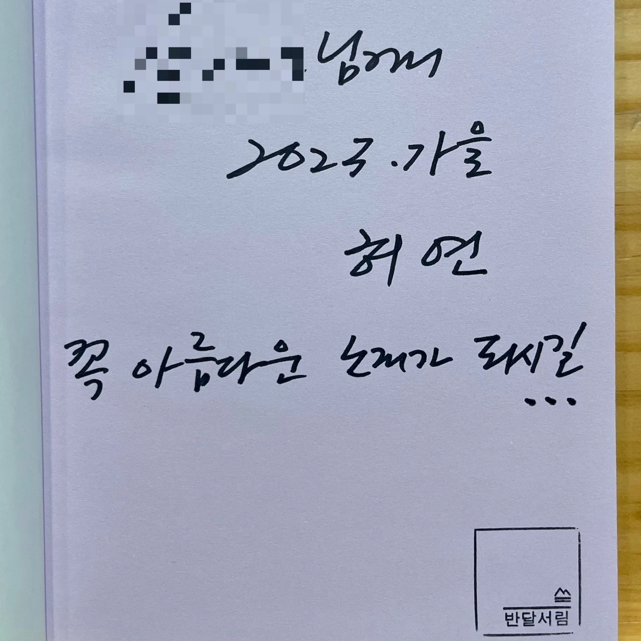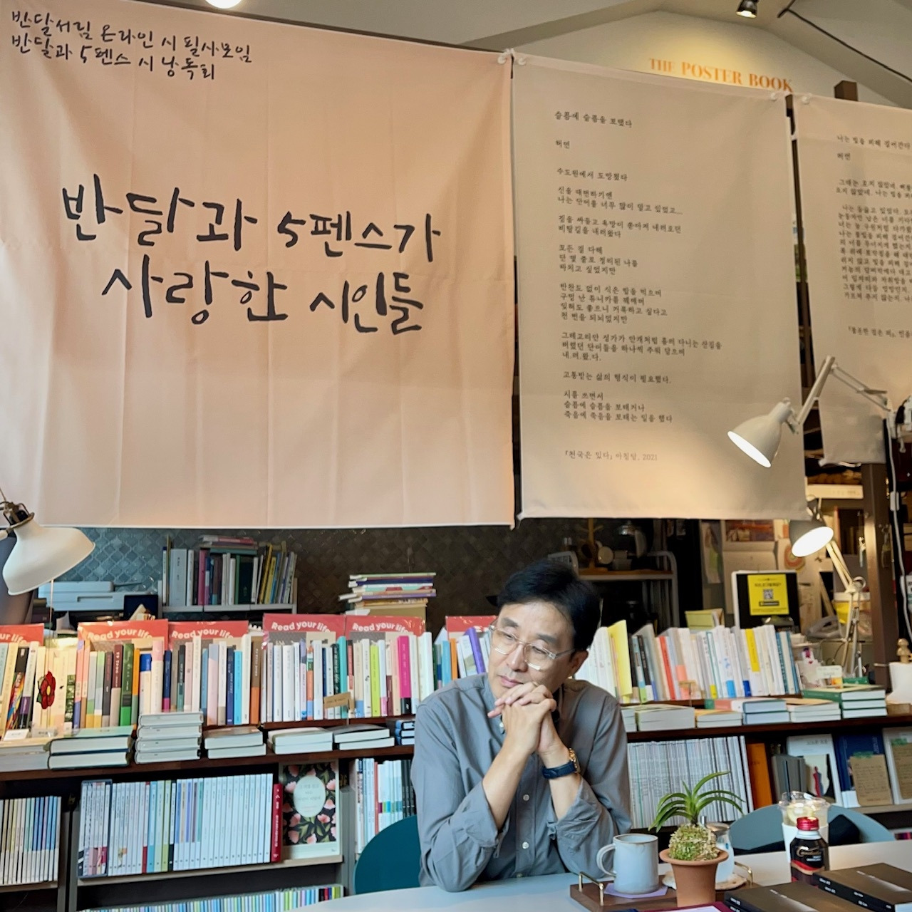 「슬픔에 슬픔을 보탰다」와 「나는 빛을 피해 걸어간다」 시가 인쇄된 현수막 아래, 그리고 허연 시인의 시집과 에세이 등 여러 종류의 책이 놓인 테이블 앞에 자리 잡은 허연 시인은, 차분하고 깊이 고뇌하는 이지적인 시인이라는 이미지에 냉철함이 살짝 가미된 듯 보였다. 그 이미지는 시인의 또 다른 직업 매일경제신문 문화부 기자로서의 정체성에서 나오는 것인가 싶었는데, 늦둥이 딸을 언급하실 때 안경 너머 날카로운 눈매가 부드러워지고 입가에 장난스러운 미소를 띠기도 하셔서 다양한 스펙트럼의 감정을 소유하신 시인이라고 생각했다. 이후 2024년 가족의 달 5월에 “반달과5펜스”에서 허연 시인의 동시집 『내가 고생이 많네』의 동시를 필사하기도 하여 시인의 다채로운 시세계에 감탄을 했던 기억이 난다.