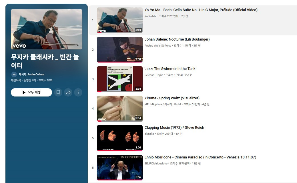 6. 아르케컬처의 유튜브 재생목록 중 무지카 클래시카 x 빈칸놀이터 21C 예술놀이터 플레이리스트 (https://youtube.com/playlist?list=PL8UUJ1D1syiSuE2pcFcMNGzUV96VsvbBo&si=x2DcjrFdolJE8gFY)