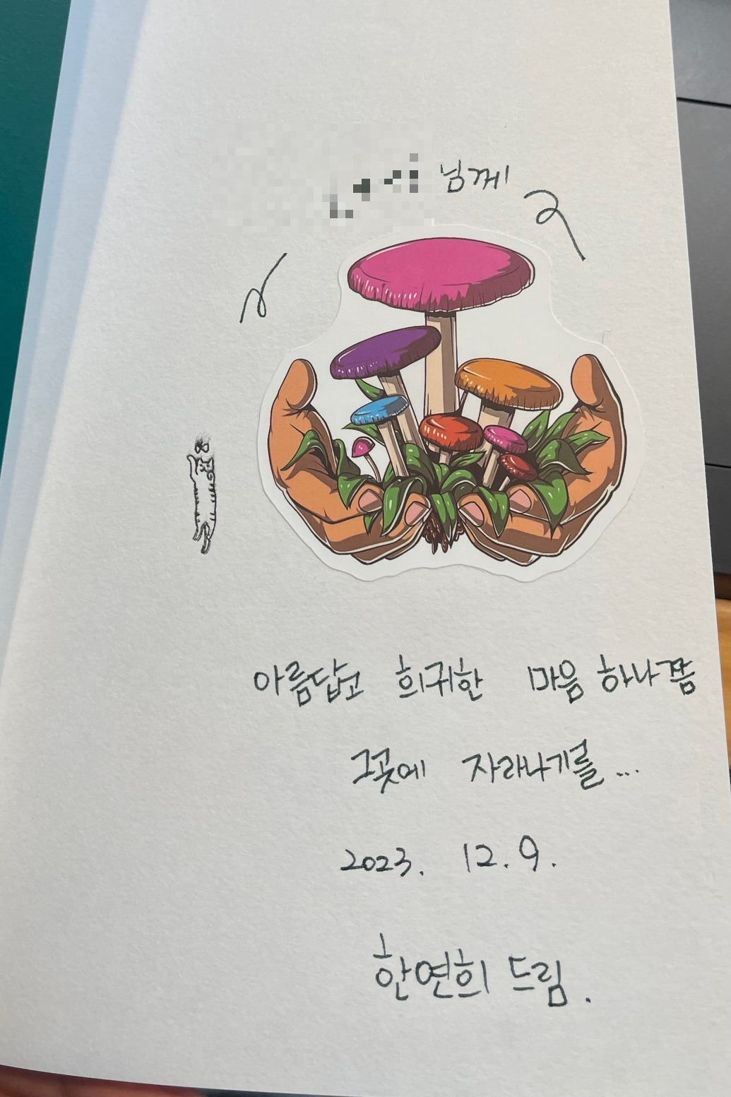 아직 시집에 수록되지 않은 보너스 트랙 「일월 육일 어떠세요?」를 읽고 시낭독회를 마쳤다. 미리 준비한 『희귀종 눈물귀신버섯』 시집에 저자 서명을 받으려는데, 한연희 시인은 각양각색의 버섯이 그려진 스티커 무더기가 들어있는 주머니를 꺼내어 하나 고르라고 한다. 두 손에 버섯을 들고 있는 모양 스티커를 골라 한연희 시인에게 건네니, 시집 첫 페이지에 그 스티커를 붙이고 고양이가 나비를 쫓아 뛰어오르는 작은 도장을 찍어주며 서명을 해주었다.