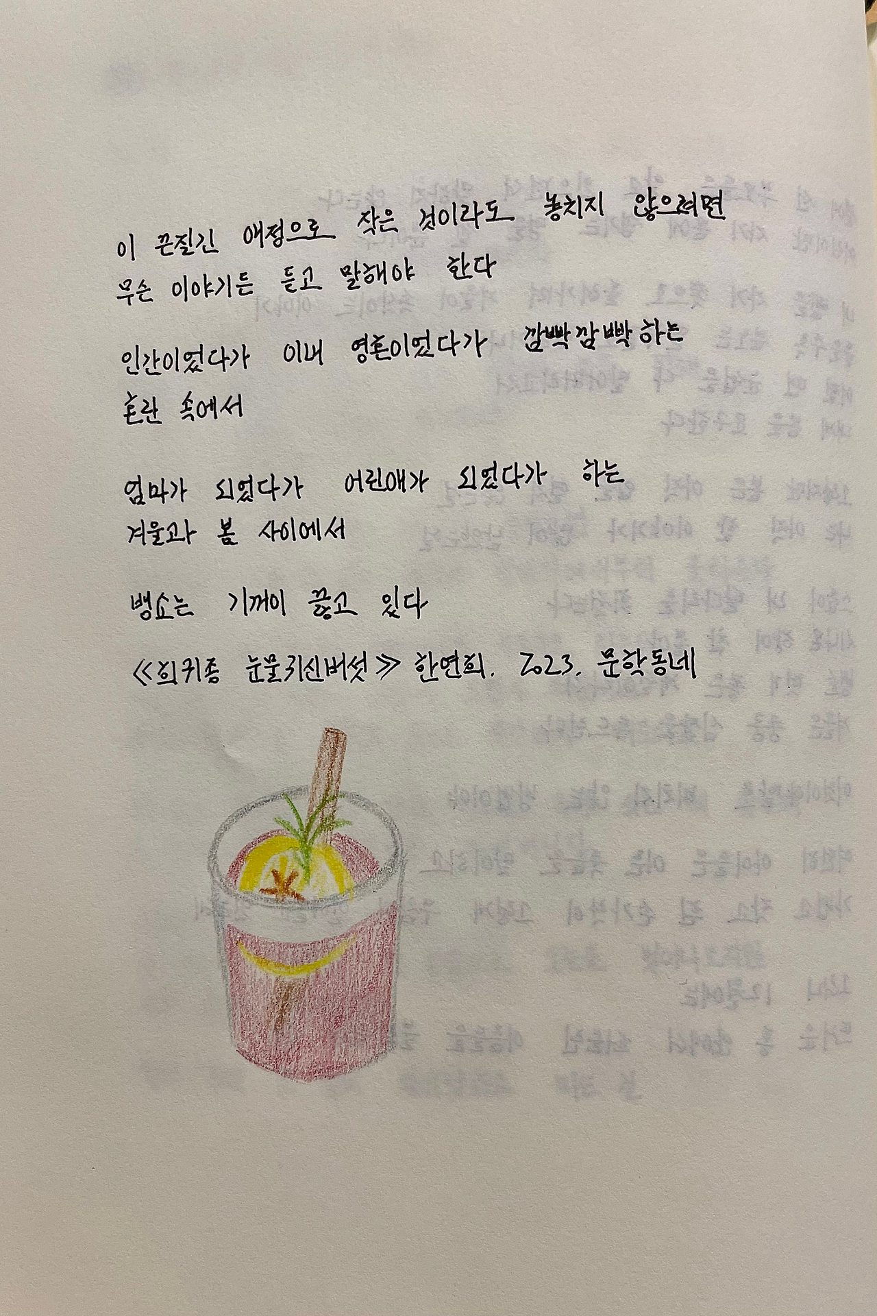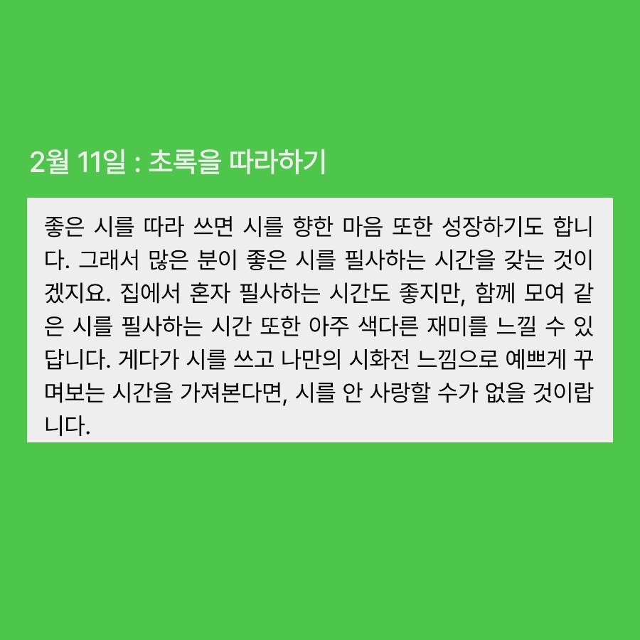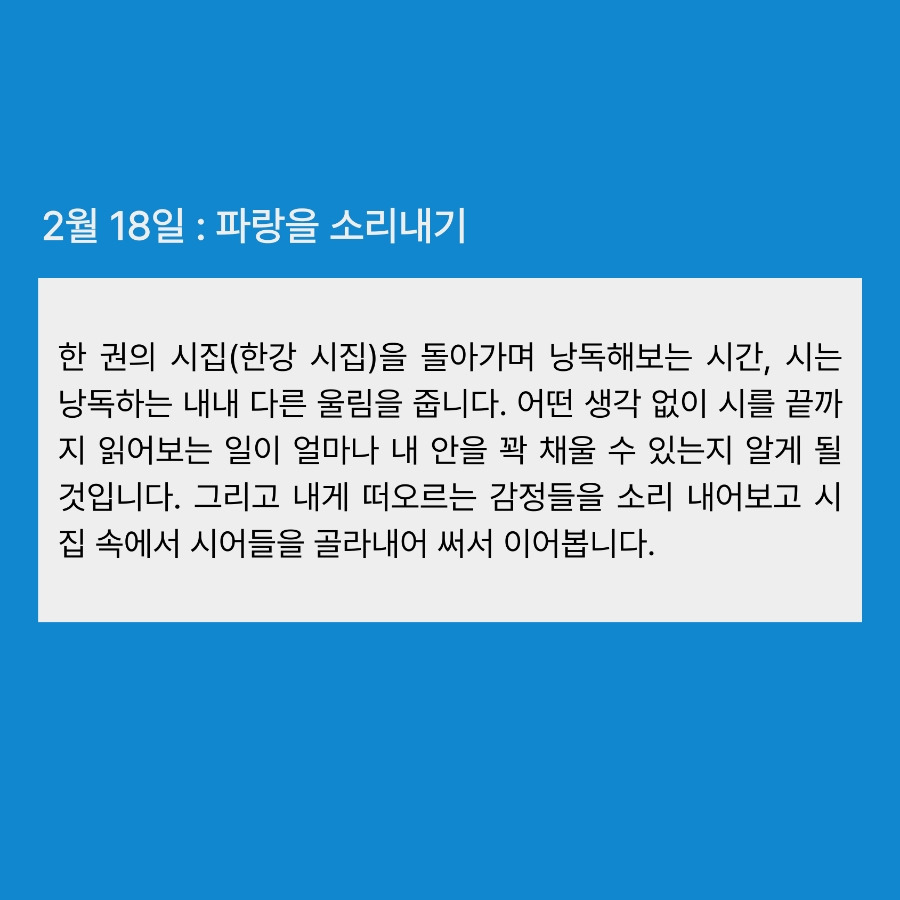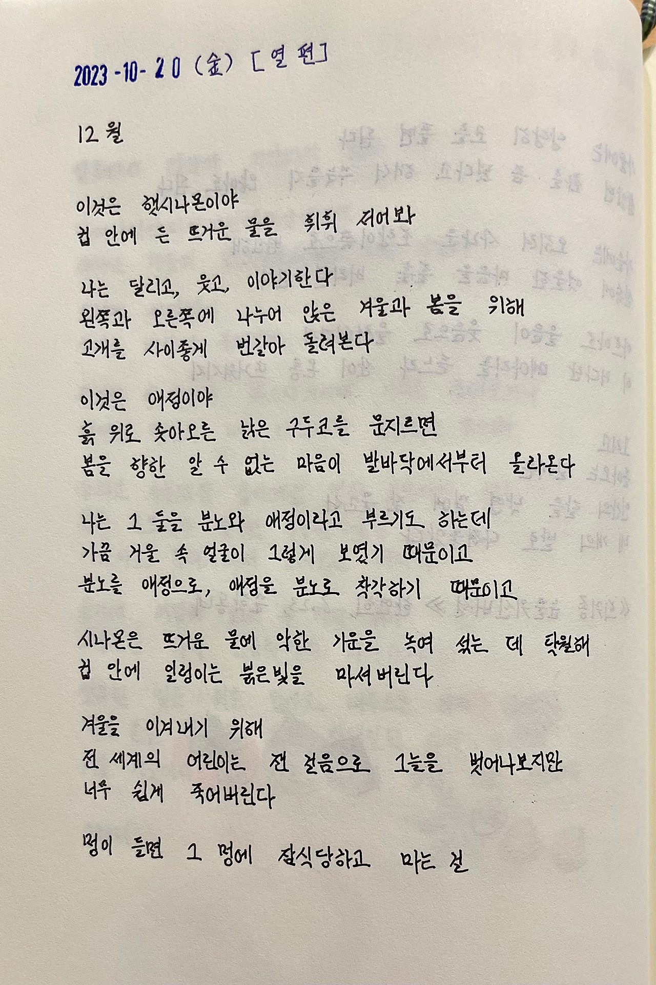 지금껏 시를 읽고 필사를 하였지만, 여러 시에서 발췌한 구절로 새로운 하나의 시를 만든 다는 생각은 해 본 적이 없어서, 독특하고 즐거운 경험이 될 것 같은 예감과 함께, 제각기 완성해 낼 다른 사람들의 시에 기대감이 들었다.