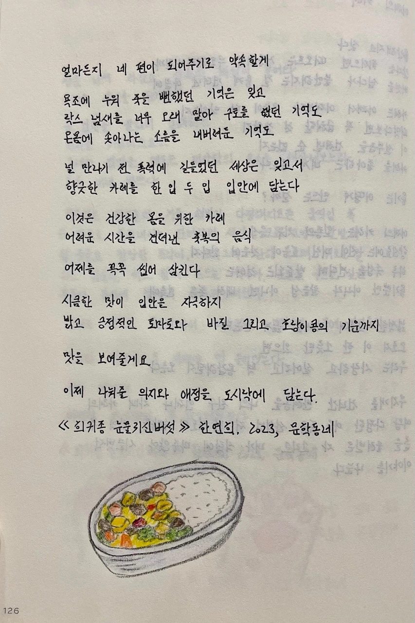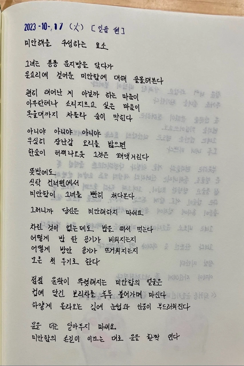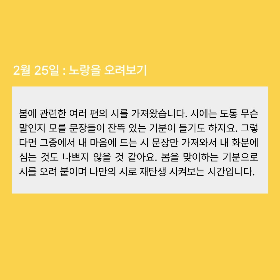 지금껏 시를 읽고 필사를 하였지만, 여러 시에서 발췌한 구절로 새로운 하나의 시를 만든 다는 생각은 해 본 적이 없어서, 독특하고 즐거운 경험이 될 것 같은 예감과 함께, 제각기 완성해 낼 다른 사람들의 시에 기대감이 들었다.