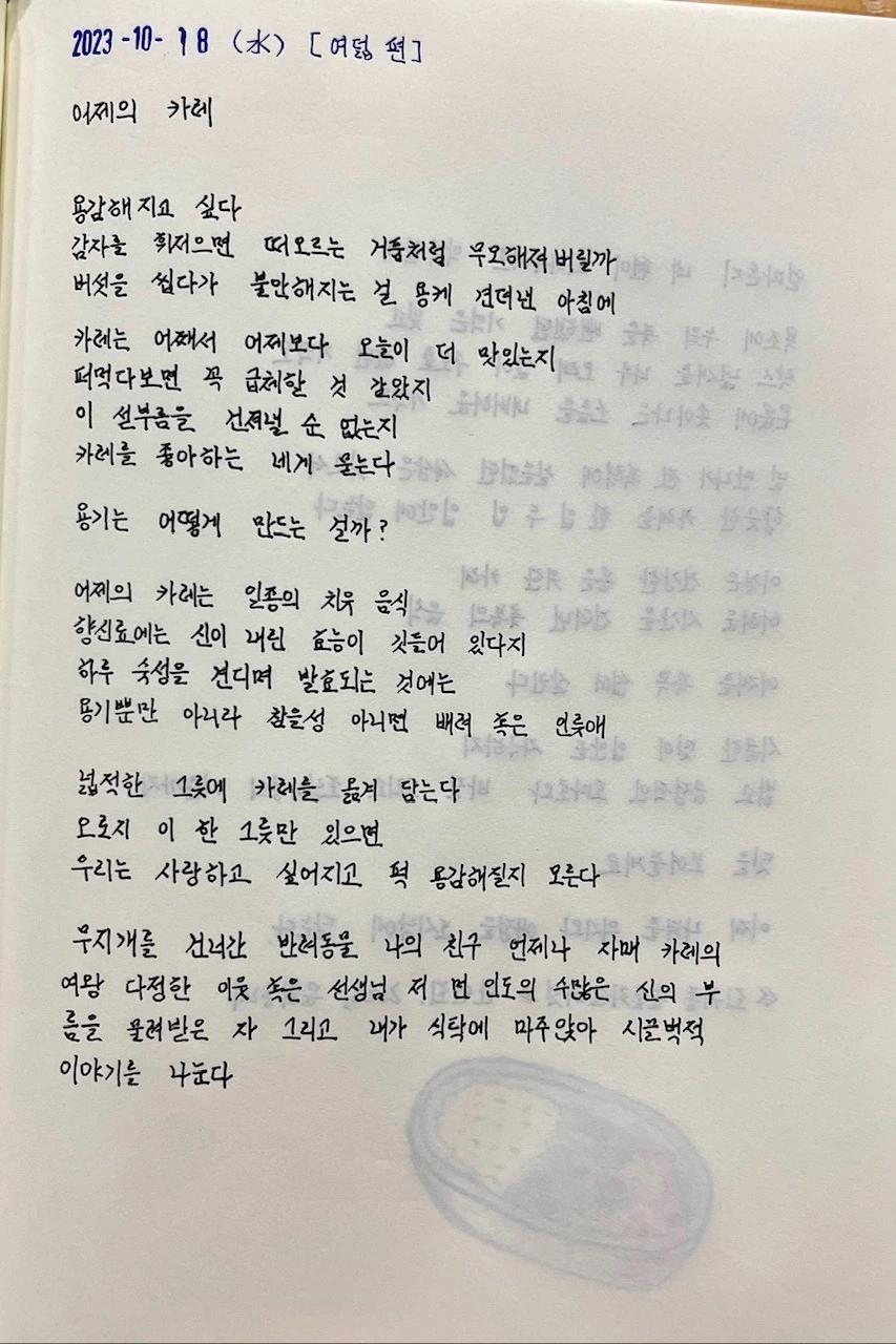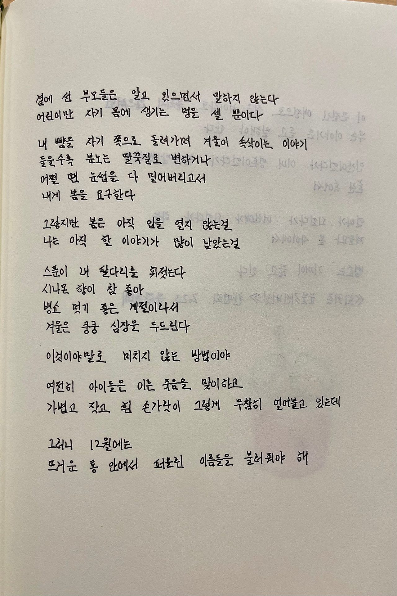 마지막 낭독시를 마치고, 참석자들은 각자 작성한 시를 돌아가며 낭독했다. 겹치는 구절도 있었지만, 신기하게도 동일하게 작성된 시는 없었다. 내가 작성한 시는 아래와 같은데, 저마다 다른 시에서 발췌한 탓에 다소 어색한 부분은 있지만, 묘하게 하나의 시로 어우러졌다는 느낌을 받았다. 그리고 그 느낌은 다른 참석자들의 시에서도 마찬가지였다.