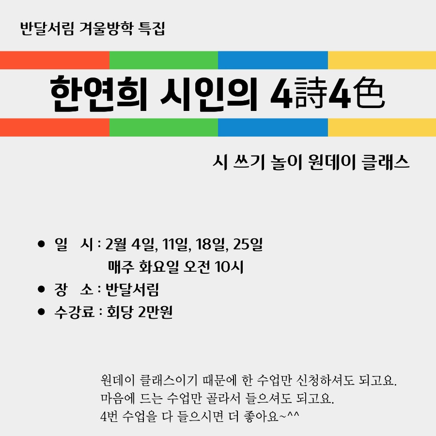 7. 반달서림 블로그의 시 쓰기 놀이 원데이 클래스 안내문 <한연희 시인의 4詩4色> (https://blog.naver.com/bandalseorim/223733013163)