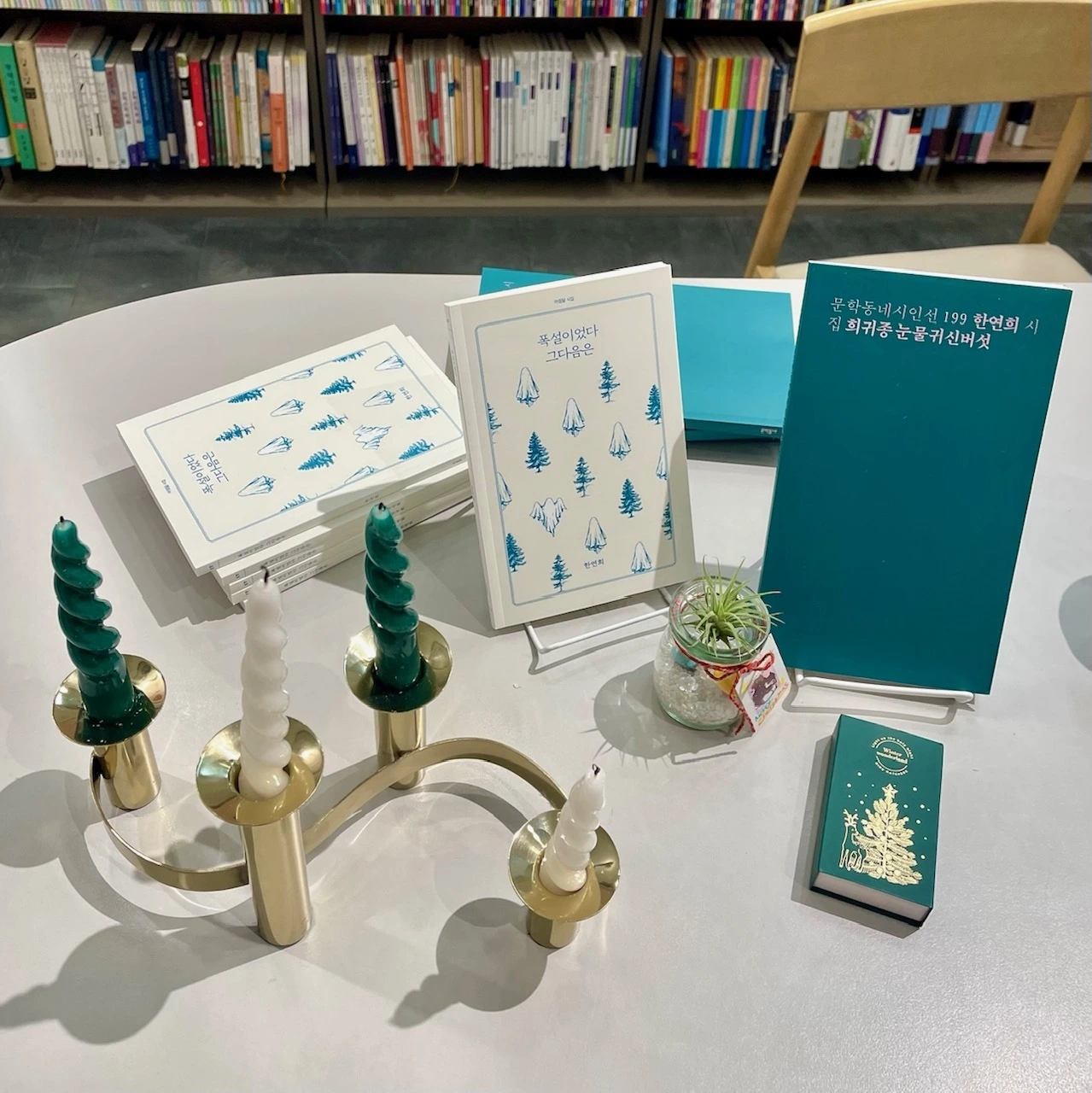 「버섯 누아르」, 「사나운 가을 듣기」, 「12월」 세 편의 시가 각각 인쇄된 현수막 아래 탁자 위에 2주일 남짓 남은 크리스마스가 이미 와있다.