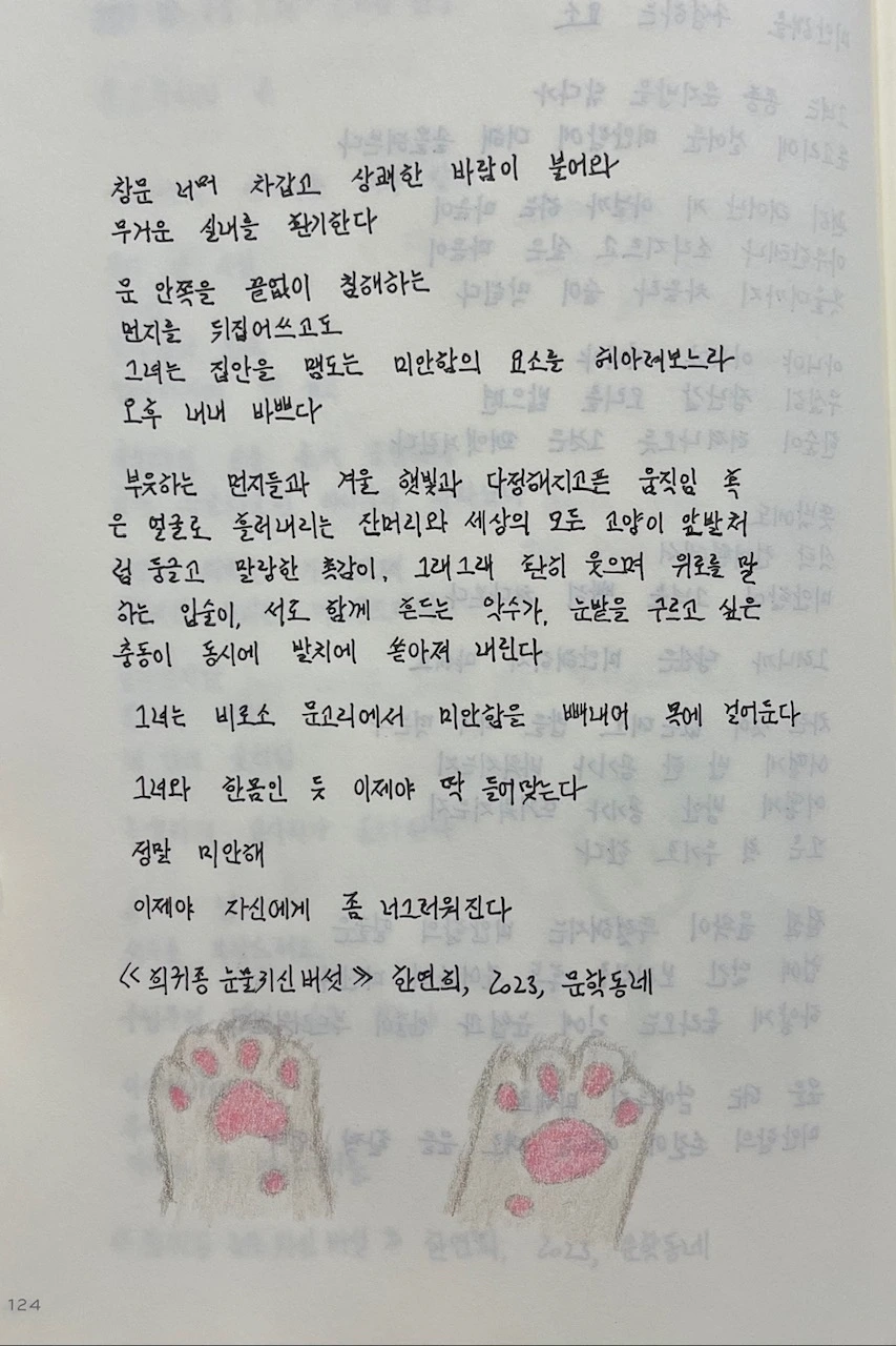 저자 서명이 하나의 이벤트였는데, 다른 참가자가 내민 『폭설이었다 그다음은』 시집에는 눈송이 스티커와 별빛 스티커를 붙여주며 그와 함께, 고양이가 달려가는 작은 도장과 고양이 발자국 도장을 첫 페이지에 꾹꾹 찍어 주고 계신 것이 아닌가? 마치 흰 눈 위에 남겨진 듯 앙증맞은 고양이 발자국이 너무나도 탐이 나서, 서점에 진열된 『폭설이었다 그다음은』 시집 한 권을 냉큼 들고 저자 서명을 받았다. 시집의 주제와 잘 어울리게 승화시킨 저자서명 이벤트에 또다시 탄복했다. 나처럼 저자 서명에 반해서 예정에 없었던 시집을 구매한 참석자들도 많아 반달서림 대표가 무척 흐뭇했던 시낭독회가 아니었을까 싶다.