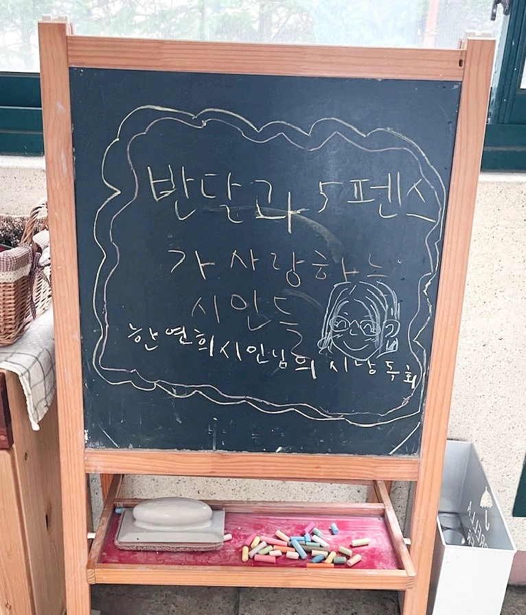 사실 한연희 시인으로 말하자면, 2024년부터 2025년 5월까지 반달서림 화요일 서점지기를 맡아 화요 시창작회를 운영하기도 하고, 2025년 2월에는 반달서림 겨울방학 프로그램으로 시 쓰기 놀이 원데이 클래스 4詩4色 를 진행하는 등 반달서림에서 활발한 활동을 하였던 소중한 시인. 한연희 시인과 함께하는 화요 시창작회는 아쉽게도 참여하지 못하였으나, 다행히 4詩4色 프로그램 중 <파랑을 소리내기>를 참여할 수 있었다. 한강 작가의 『서랍에 저녁을 넣어 두었다』 시집 한 권을 낭독하며 이야기하는 프로그램이었는데, 이 경험도 별도의 글로 남겨보고자 한다.