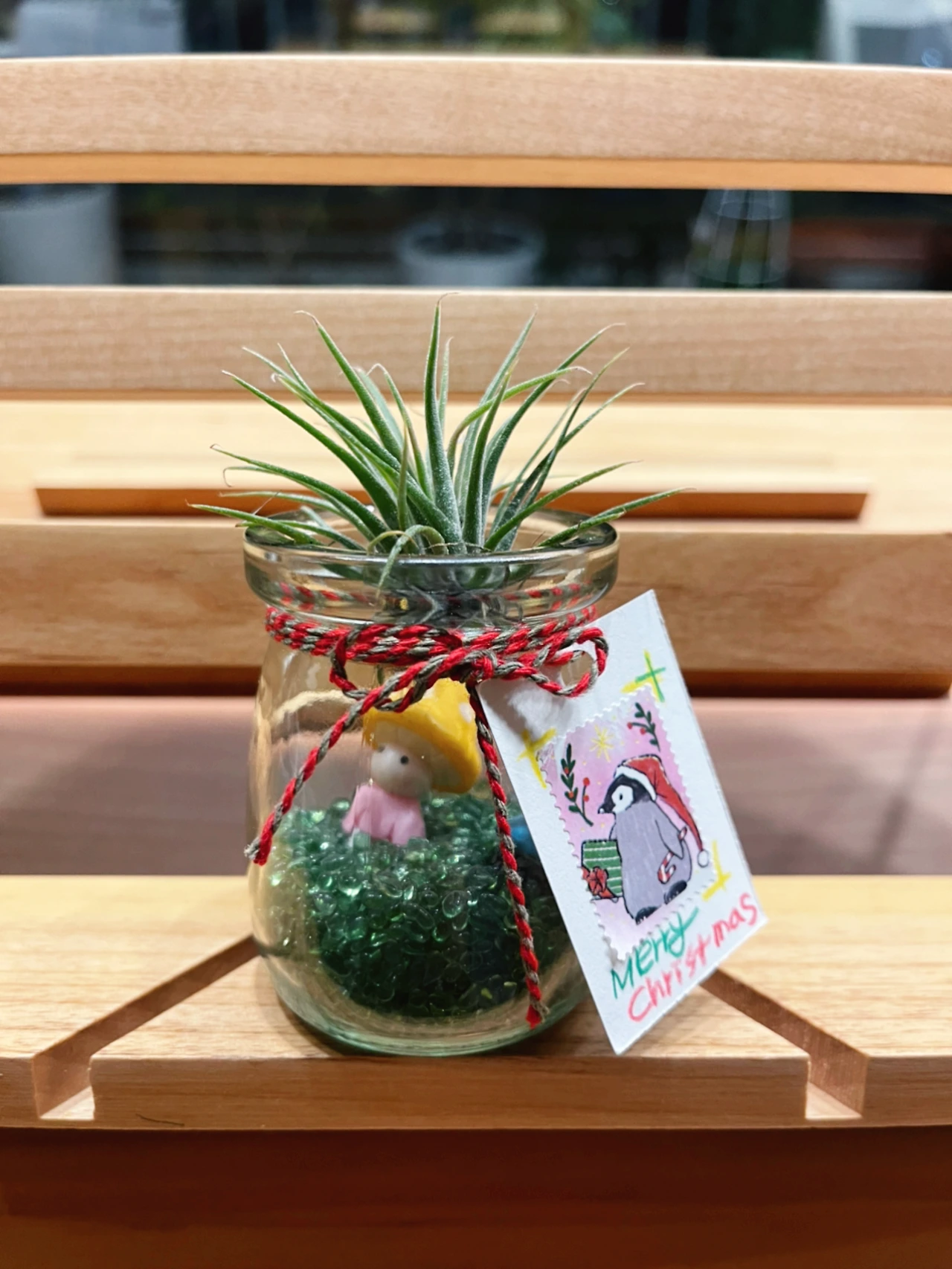 두 시집과 함께, 멋진 촛대에 올려진 하얀색과 청록색 초와 청록색 성냥이 놓이고, 테이블 뒤 앉은 한연희 시인이 화룡정점으로 어우러져 크리스마스 감성의 시낭독회 준비가 완성되었는데, 한연희 시인은 또 참석한 인원수에 맞추어 준비한 너무나도 앙증맞은 오브제를 테이블 위 맨 앞 줄에 전시하는 것이었다. 목에 붉은 리본을 맨 작은 유리병 안 바닥에 흰색 또는 초록색의 알갱이를 깔고 그 위에 작은 버섯 피규어 2개를 놓은 후, 유리병 입구에 틸란드시아를 올린 오브제였는데, 한연희 시인이 하나하나 직접 제작하고 준비하였다는 설명을 듣고 한 해 동안 시를 많이 읽고 필사한 보상으로 시인 산타에게 크리스마스선물을 미리 받는 것 같아 뿌듯한 마음이 들었다.