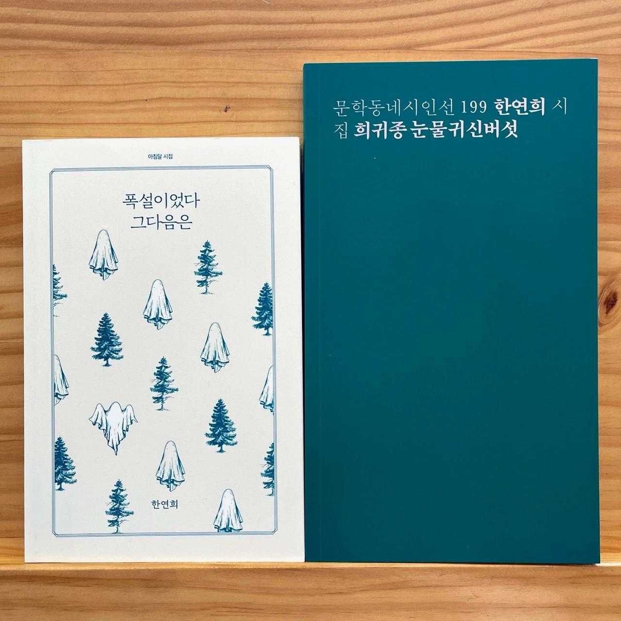 2016년 창비신인문학상으로 등단한 한연희 시인은 표지에 청록색을 주된 색깔로 사용한 두 권의 시집을 출간하였는데, 아침달 출판사에서 출판된 『폭설이었다 그다음은』 시집과 문학동네 출판사에서 출판된 『희귀종 눈물귀신버섯』 시집이다.