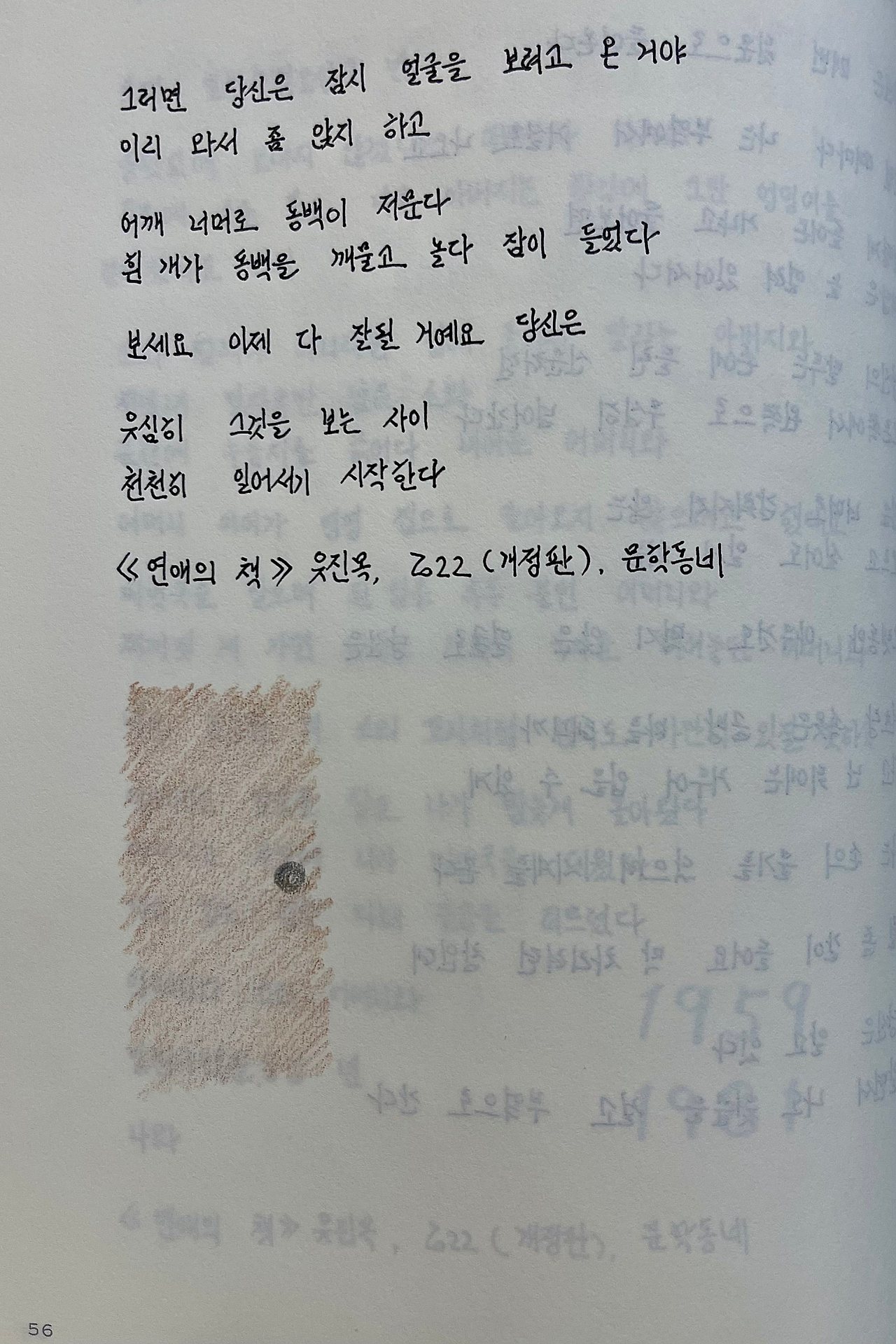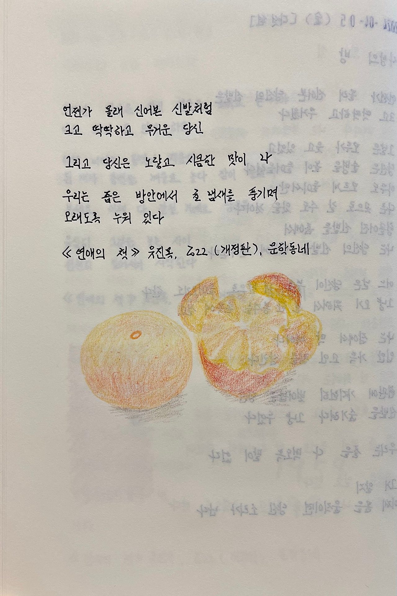 반달과 5펜스는 유진목 시인의 시집 『연애의 책』과 『작가의 탄생』에서 각각 다섯 편씩 발췌하여 총 열 편의 시를 필사하였다. 신기하게도 신진목 시인의 시는 이해하기 쉽지 않지만, 읽으면 머릿속에 영상이 재생되는 특징이 있었다. 특히, 『작가의 탄생』 시집은 ‘장’이나 ‘부’가 아닌 ‘막’으로 구분하고, 8막의 「식물원」은 시나리오처럼 쓰여 있어, 시나리오집의 경계를 오가는 시집인가 싶었는데, 시낭독회에서 유진목 시인이 시나리오 작가이자 영화감독이라는 사실을 알고 나니 시를 읽을 때의 그 묘한 느낌을 어렴풋하게나마 이해할 수 있었다.