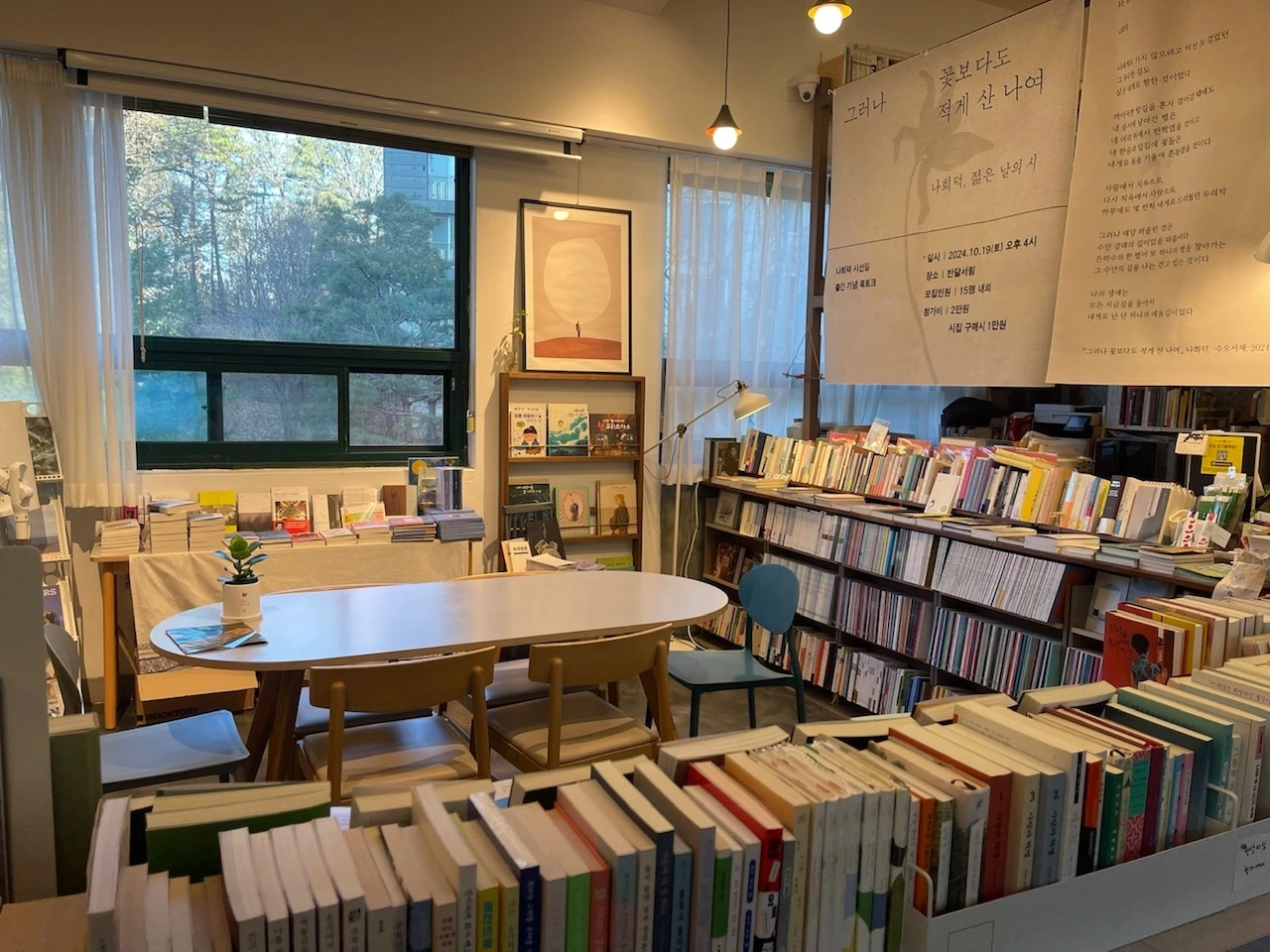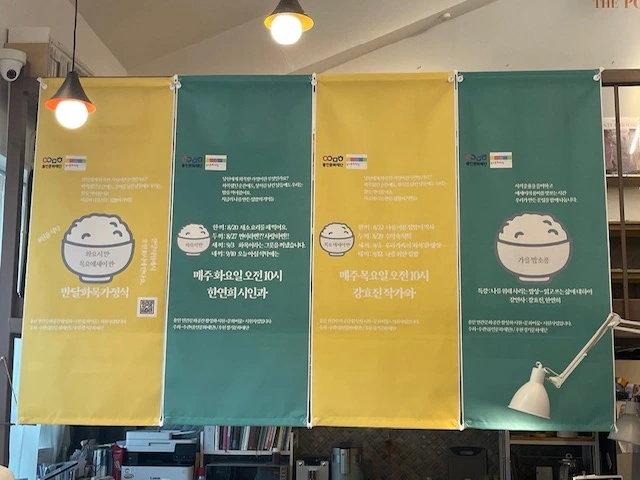 마지막 근무를 하며 따뜻한 2층 다락에 올라가 새로운 시선으로 아래를 내려다보았다. 시낭독회를 위한 현수막과 ‘반달화목가정식’이라는 제목의 에세이 모임을 위한 현수막을 설치한 기억이 새록새록 돋아났다. 2층에서 현수막을 설치하고 1층으로 내려가 현수막 간 간격과 높이를 점검하고, 다시 2층으로 올라가 조정했던 기억. 다락에서 드리워진 멋스러운 현수막은 반달서림에서 열렸던 그 많은 행사의 품격을 한층 더해 주었기에 2층과 1층을 오르락내리락했던 수고는 수고로움이 아닌 뿌듯함이었다.