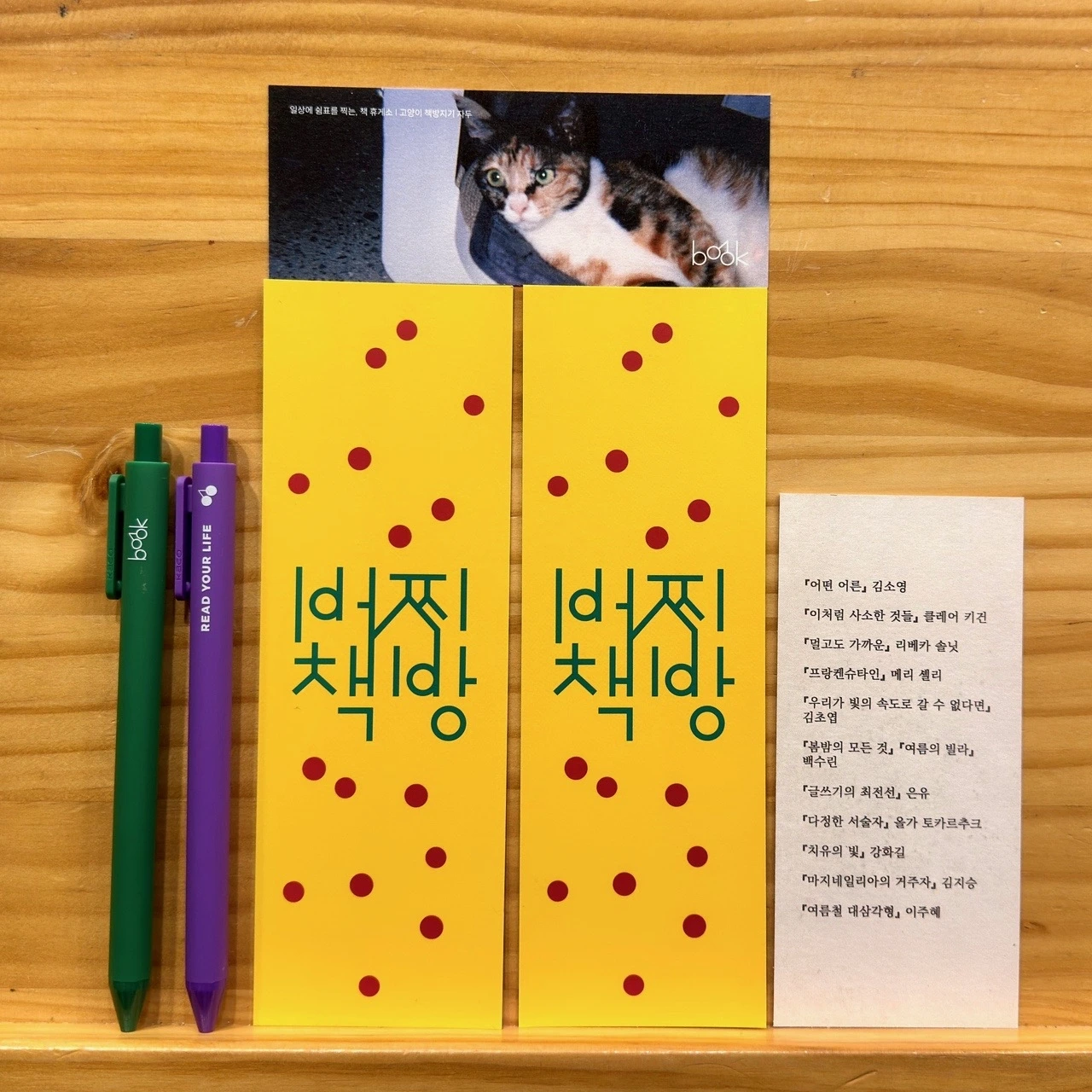 북토크날이 되었다. 월요일 아침 북토크 시간에 맞추기 위해 버찌책방지기는 일찍부터 서둘렀을 터였다. 그런데 그 바쁜 와중에 버찌책방 책갈피와 스티커, 볼펜을 챙겨 일일이 관객에게 나누어 주는 정성이 고마웠다. 다시 어수선한 분위기를 정리하고, 베트남에 있는 반달서림 대표 대신 사회를 맡은 『오늘도 나를 대접합니다』 의 강효진 작가 (https://brunch.co.kr/@ebec0174a6a7411/34)가 『버찌책방은 다 계획이 있지』 의 조예은 작가를 소개해 주었다.