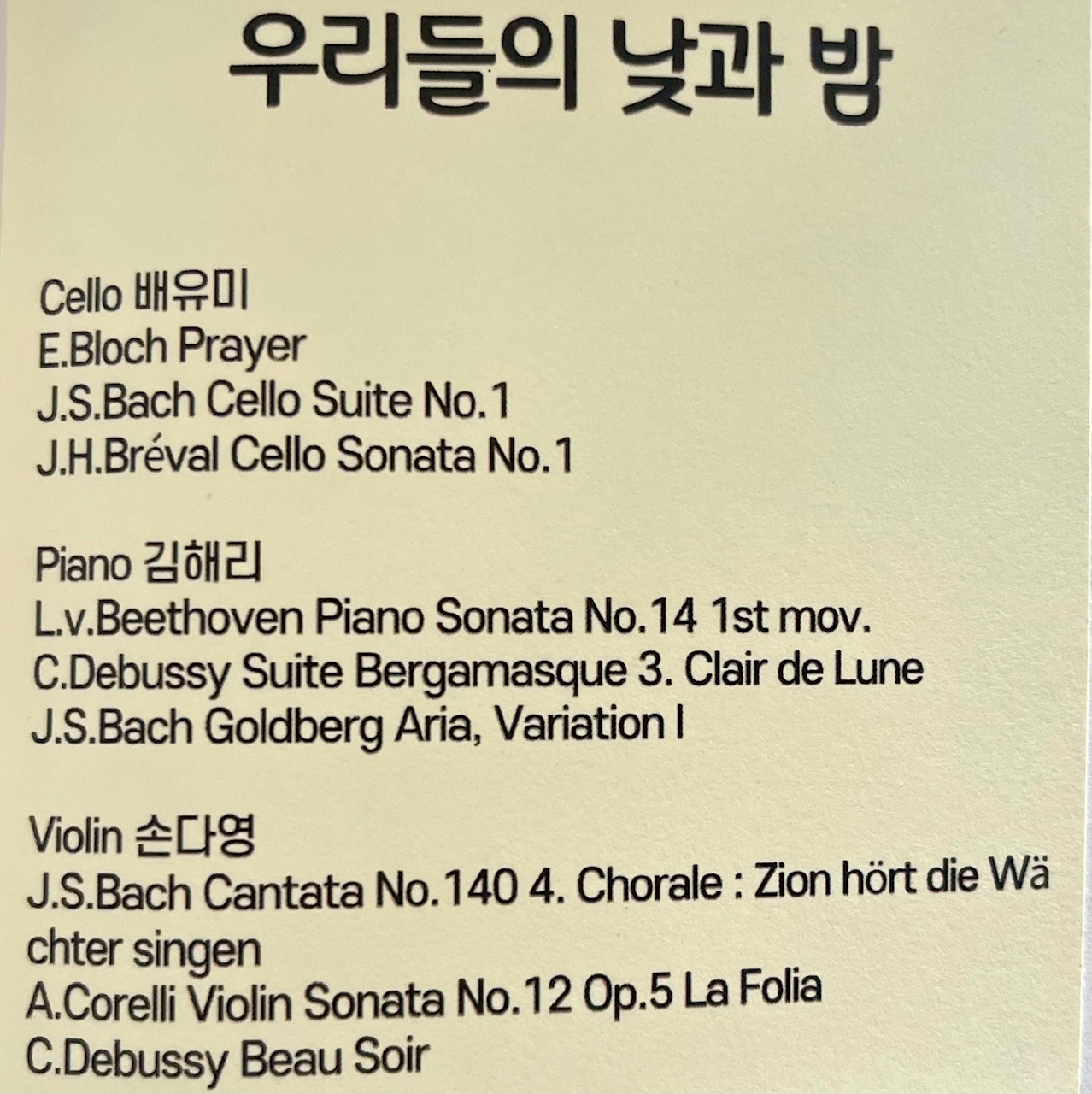 길을 걸어가는 중에 코로나라는 복병을 만나 그 길의 방향이 조금씩 달라졌지만, 그 달라진 길에서 의미를 찾고 열심히 주어진 삶을 살고 있는 모습이 연주하는 중간중간 보이는 듯했고, 특히 세 연주자가 함께 연주한 바흐의 칸타타 140번 중 4악장을 듣고 있노라니, 음악에 담긴 진심과 열정 그리고 그들 사이의 조화로움이 느껴졌다.