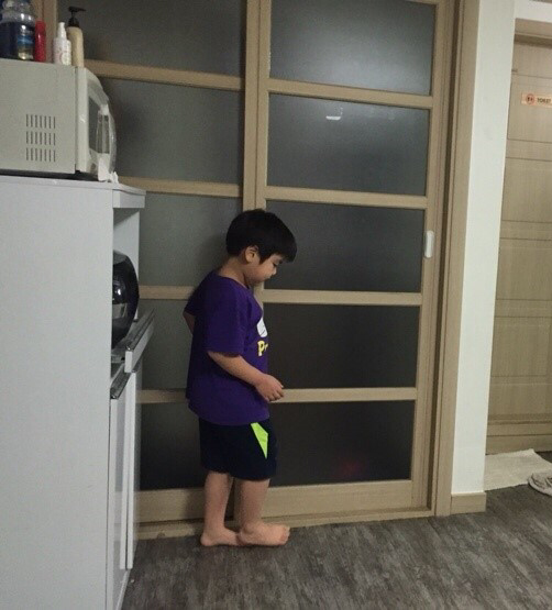 통통한 발로 중문의 길이를 재봅니다.