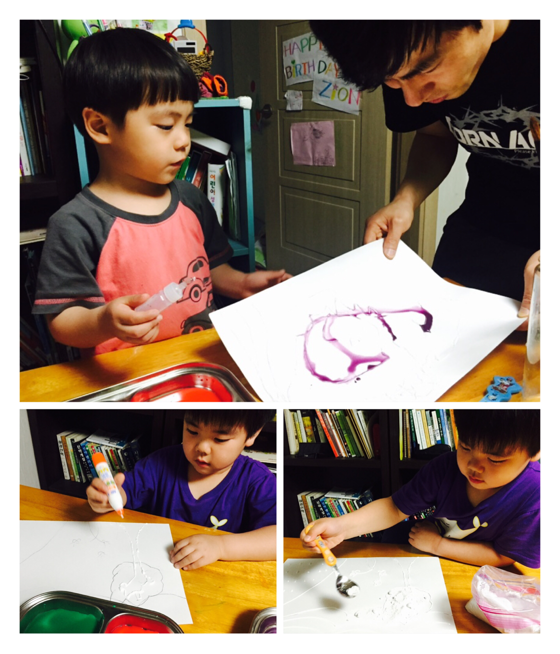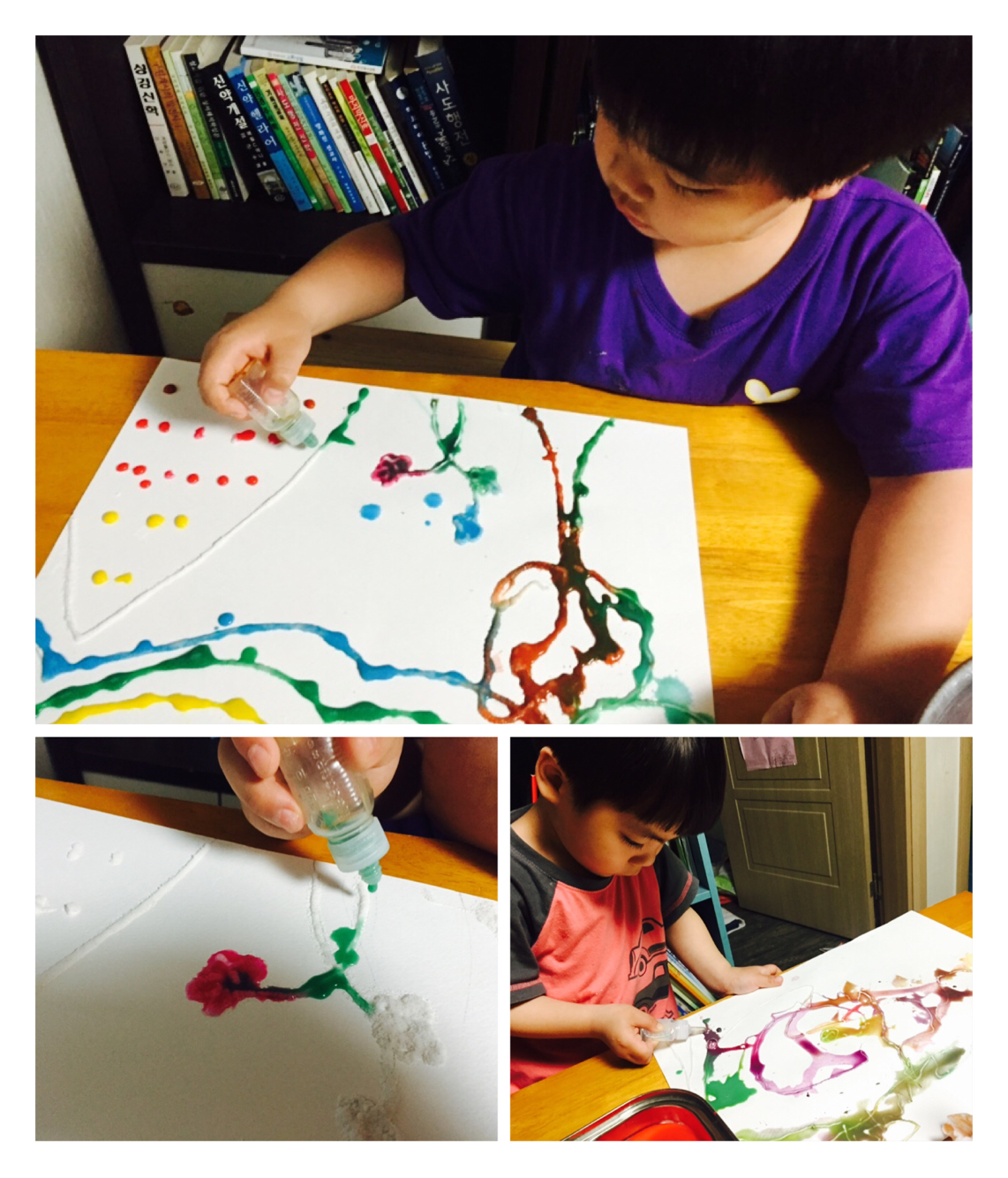 "엄마,꽃잎이 물먹는것 처럼 그림 꽃도 알아서