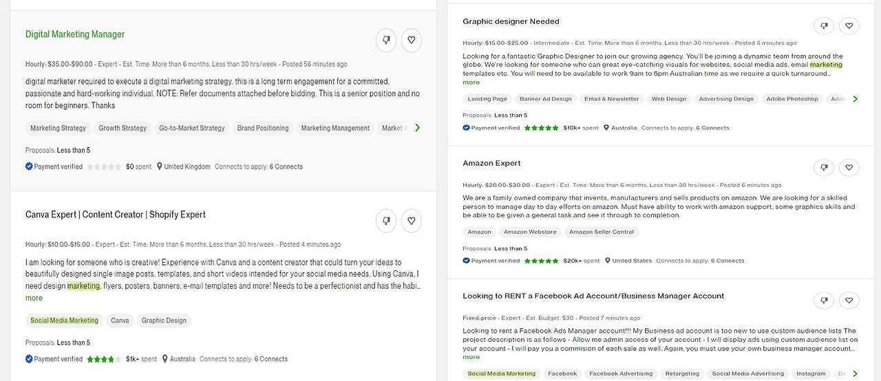 업워크(Upwork)에 예를 들어 "Marketing" 키워드를 치면 나오는 일거리들만 42,375개다. 그래서 내가 다양한 일거리를 찾은 개인적인 방법은