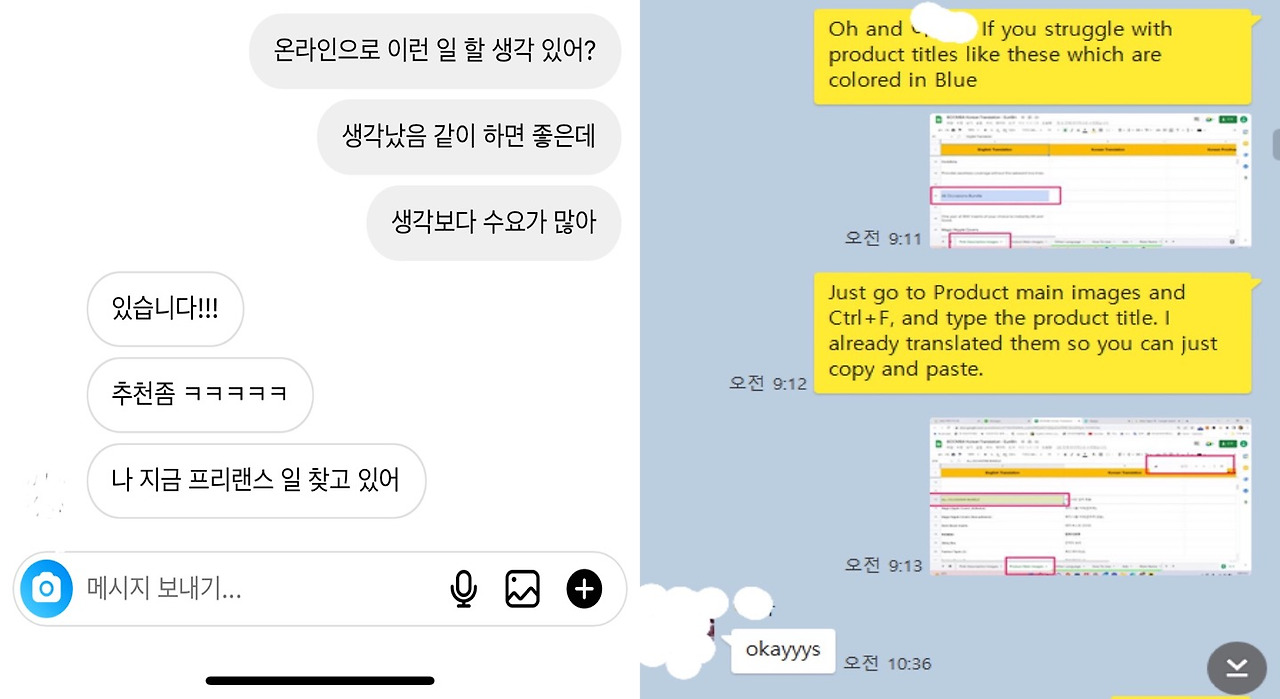 거기서 영감을 얻었다. 작년에 졸업한 한국외대에서 알고 지낸 유학생들 중 한국어와 영어를 구사할 줄 아는 친구가 있었다. 한국에 사는 그 친구에게 연락하니 아직 무직이라 프리랜서 일이라도 찾고 있다고 하더라. 그 친구에게 캐주얼하게 영한 번역물을 나눠주고 마감일을 정해주었다. 웹사이트 상품 상세페이지를 번역하는 것이고 1차 번역을 완성하면 내가 2차로 보완하기로 했다.