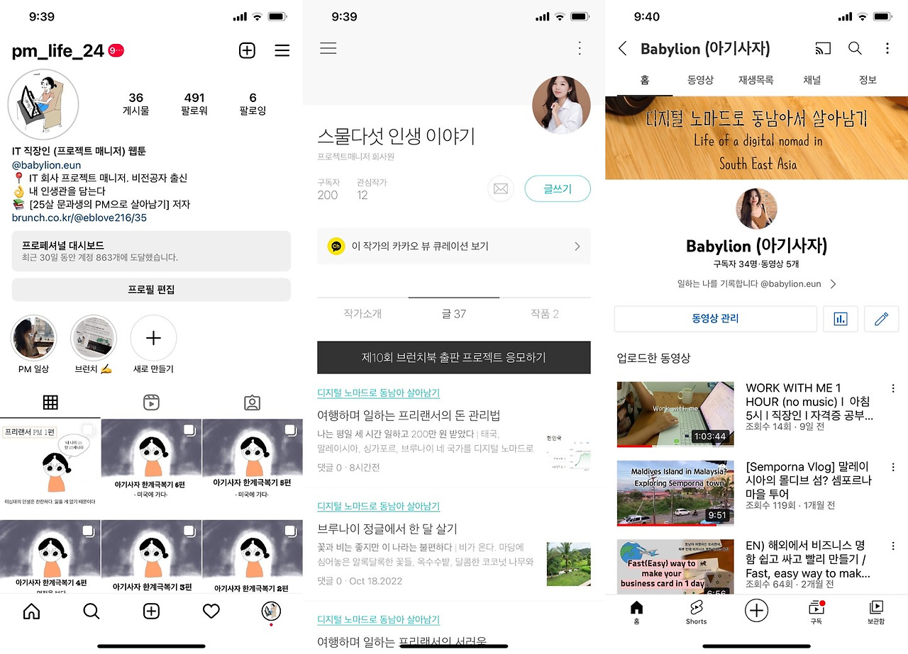 이 외 시간은 하고픈 부업들 몇 가지를 시도해봤다. 취미로 유튜브 영상을 만들기도 하고, 투자를 시도해보기도 하고, 브런치 글을 썼다. 인스타그램 만화도 정기적으로 발행해 올리고 국내 기업 리서치도 했다. 네이버 OGQ 만화작가도 시도했다. 구독자 상관없이 최대한 다양한 일을 해보고 내 일상을 기록하려는 몸부림이었다.