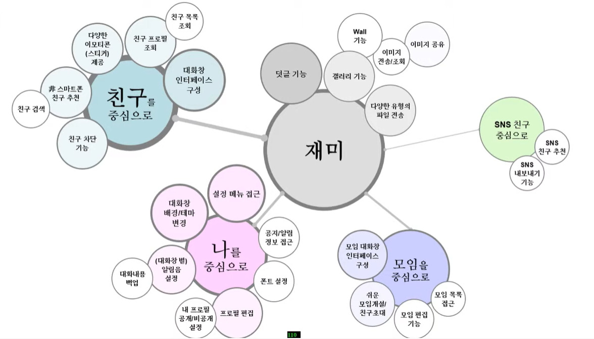 그렇다면, '모임을 중심으로' 주체에 '모임 대화창 인터페이스 구성', 쉬운 모임 개설/친구 초대', '모임 편집 기능' 등 하위 객체를 이런 식으로 주체와 객체에 맞춰 아이디어를 꼬리에 꼬리를 무는 형태로 (To-Be) 기능을 정리하는 것입니다.