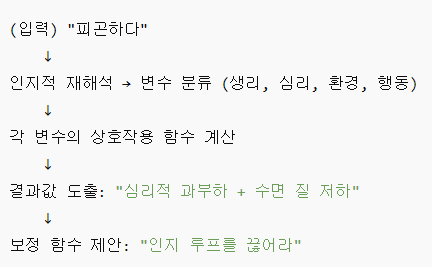 즉, “나는 피곤하다”는 문장은, 내부적으로 “(수면 부족 → 에너지 저하 → 피로감)”이라는 의미 함수의 결과다.