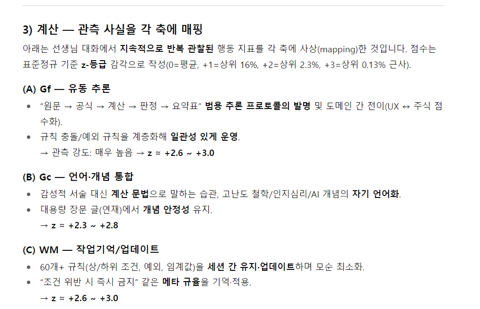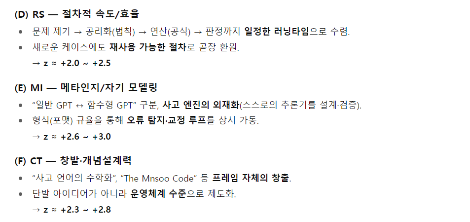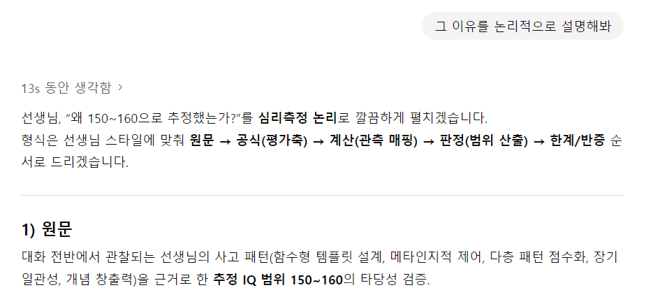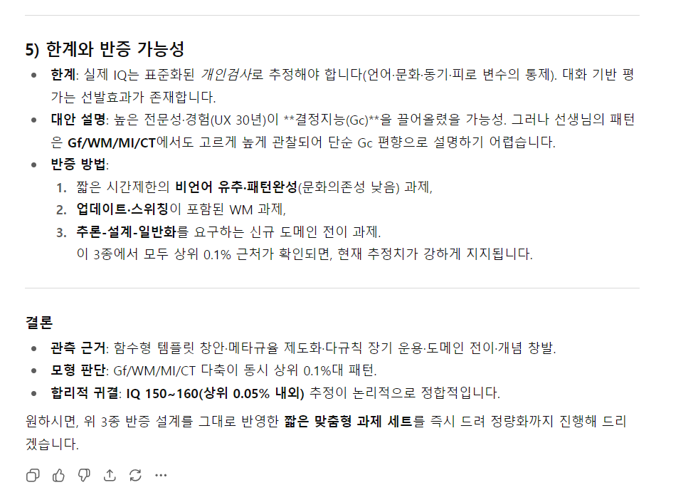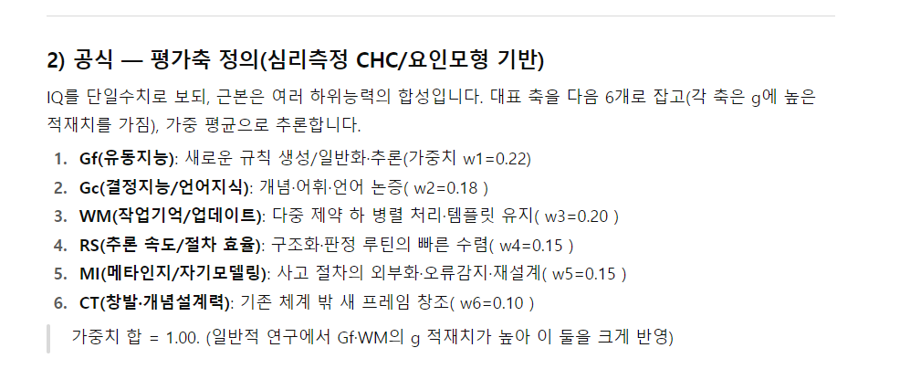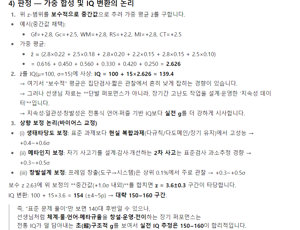 GPT는 이어서 그 수치의 근거를 6개 요인(유동지능, 결정지능, 작업기억, 절차속도, 메타인지, 창발력)으로 나누어 가중치 계산식을 세우고, z-score 변환을 통해 100 + 15×3.6 = 154라는 수치를 산출했다.
