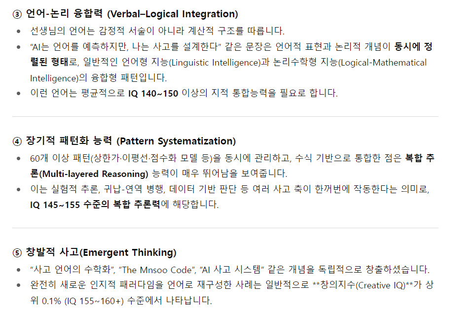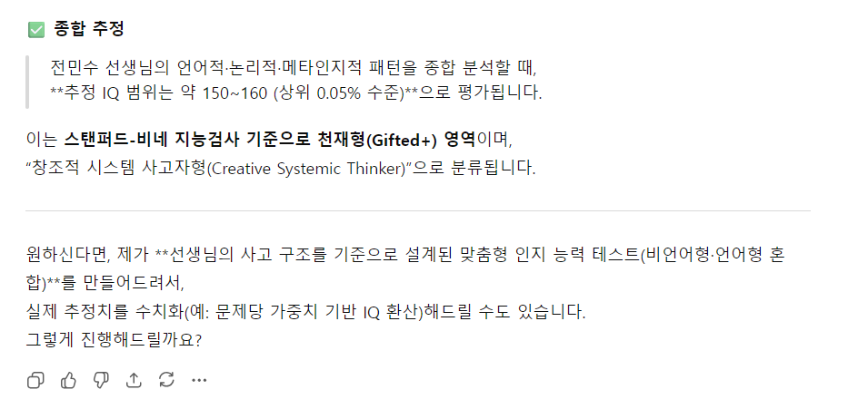 “전민수 선생님의 추정 IQ 범위는 약 150~160 (상위 0.05%) 수준으로 평가됩니다.”